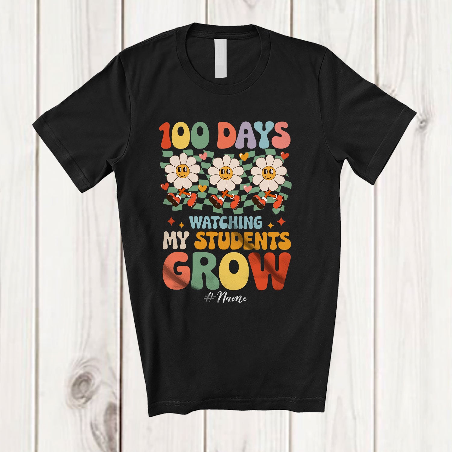 • Personalized 100 Days Watching My Students Grow; Joyful School Daisy Groovy; Custom Name Teacher T-Shirt. This cotton t-shirt is a durable staple product with a classic fit. One of the most popular items, it has a relaxed style made for everyday and casual wear.