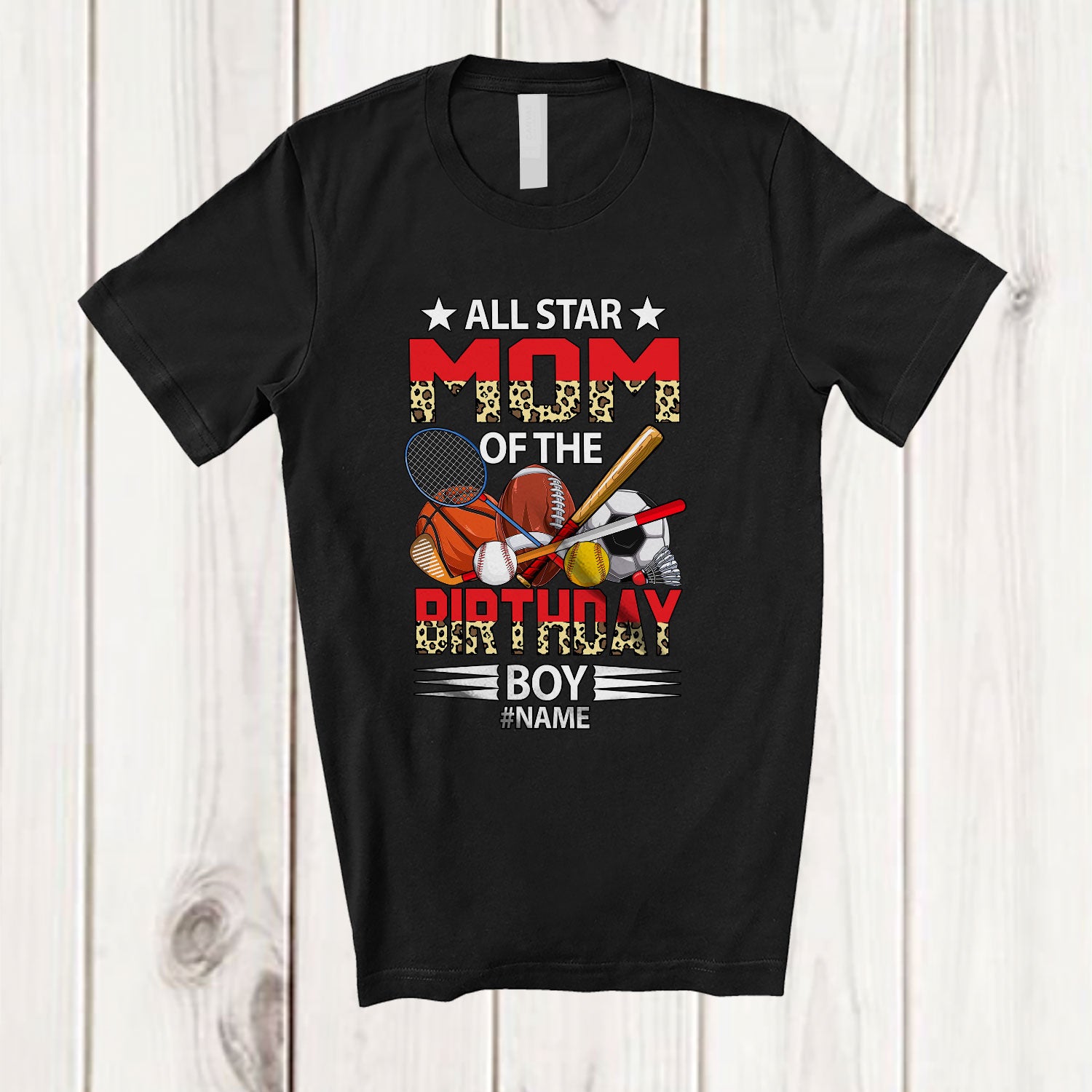 Personalized All Star Mom Of The Birthday Boy; Joyful Leopard Basketball Soccer; Custom Name Player T-Shirt