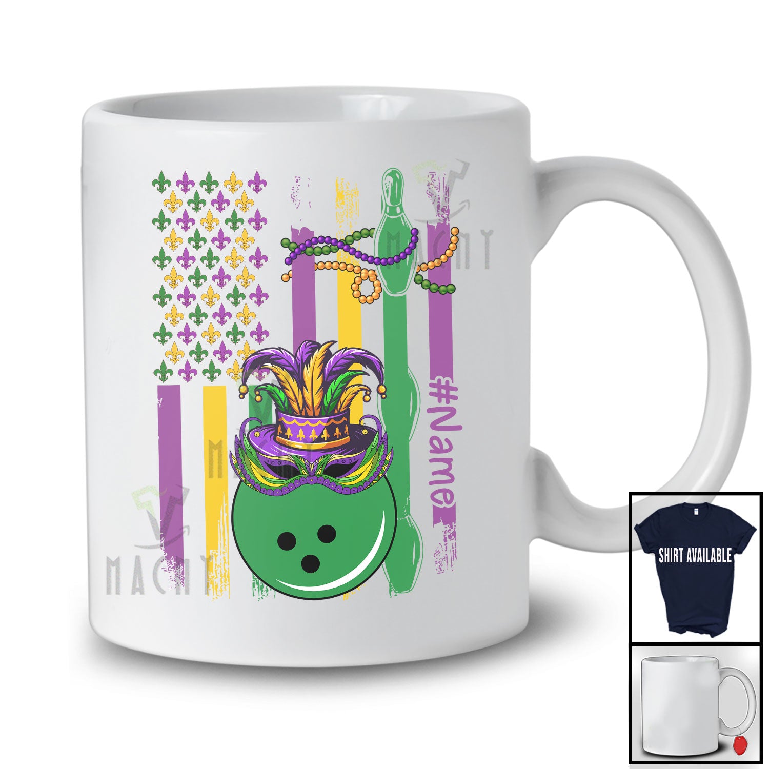 Personalized American Flag Mardi Gras Bowling; Joyful Mardi Gras Custom Name Sport Player T-Shirt. This cotton t-shirt is a durable staple product with a classic fit. One of the most popular items, it has a relaxed style made for everyday and casual wear.