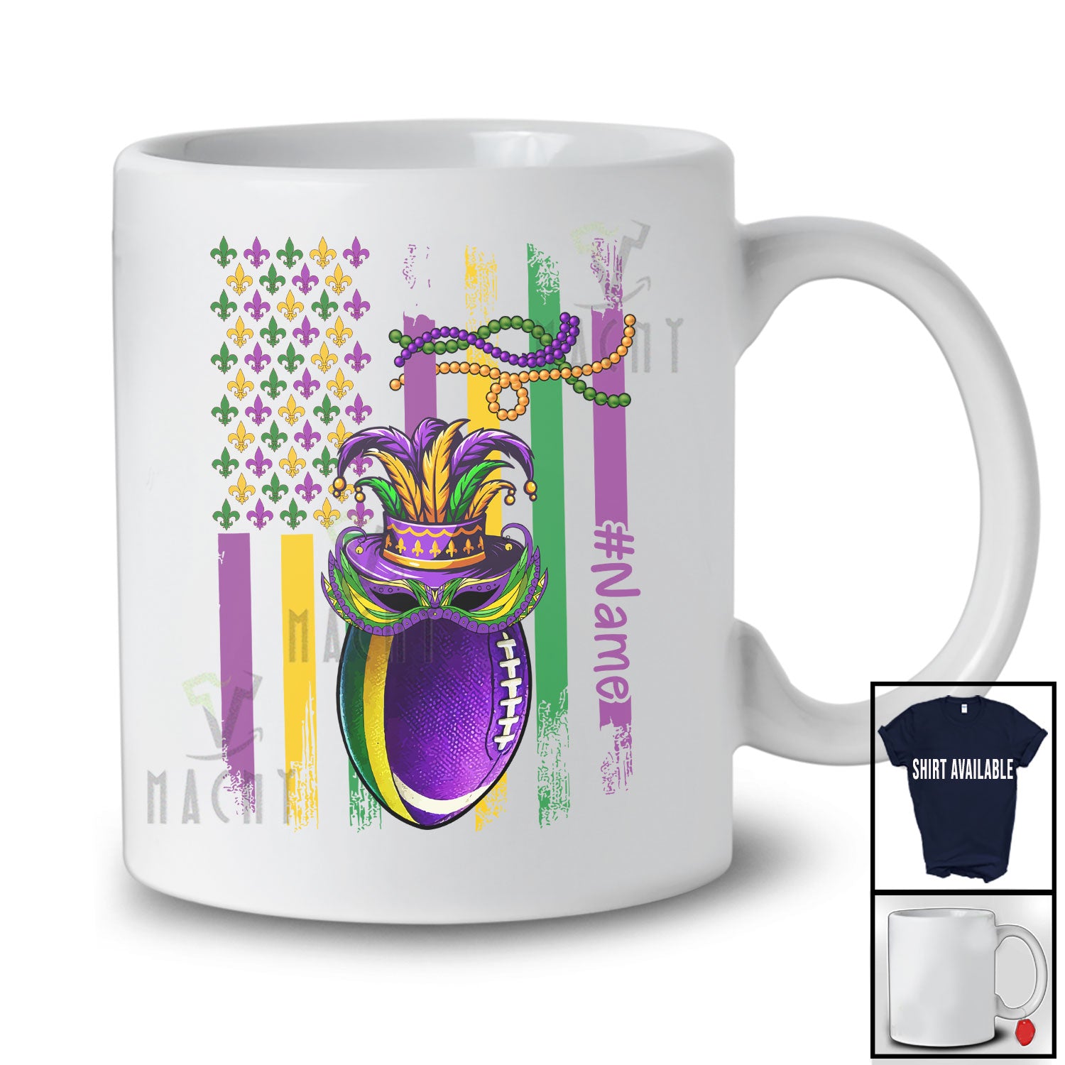 • Personalized American Flag Mardi Gras Football; Joyful Mardi Gras Custom Name Sport Player T-Shirt. This cotton t-shirt is a durable staple product with a classic fit. One of the most popular items, it has a relaxed style made for everyday and casual wear.
