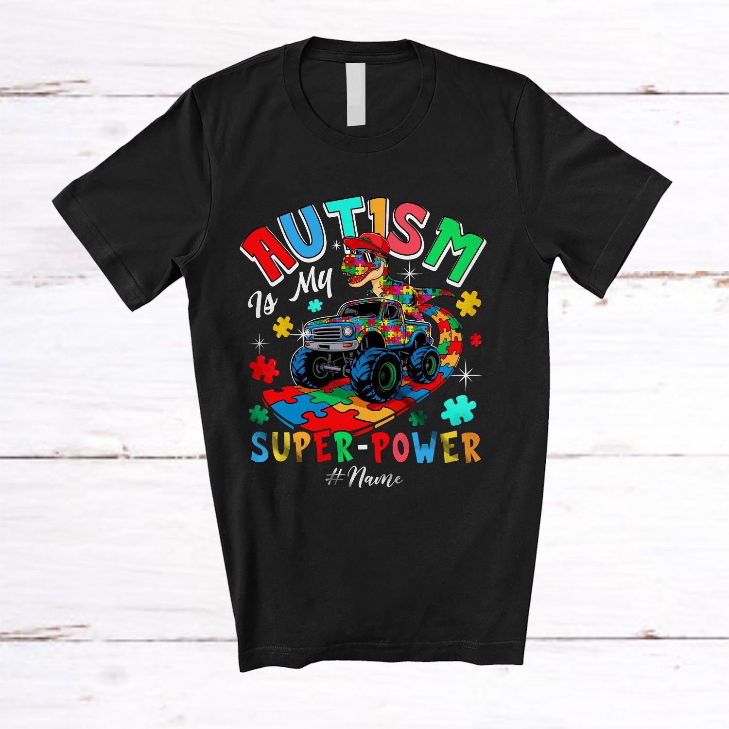 Personalized Autism Is My Super-power; Humorous Custom Name Puzzle Dino T-Rex On Monster Truck T-Shirt