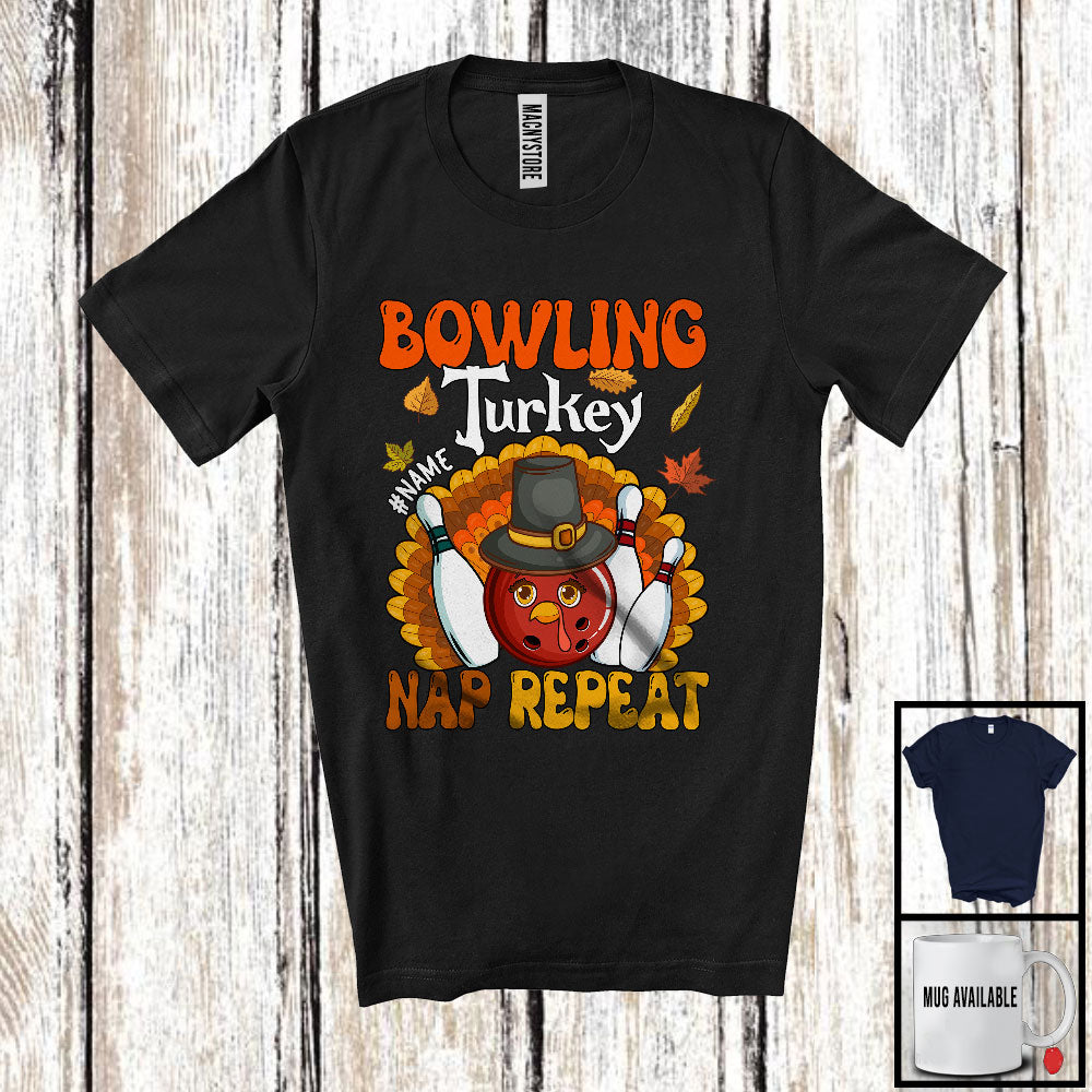 Personalized Bowling Turkey Nap Repeat, Joyful Thanksgiving Fall Leaves, Custom Name Sport Player T-Shirt