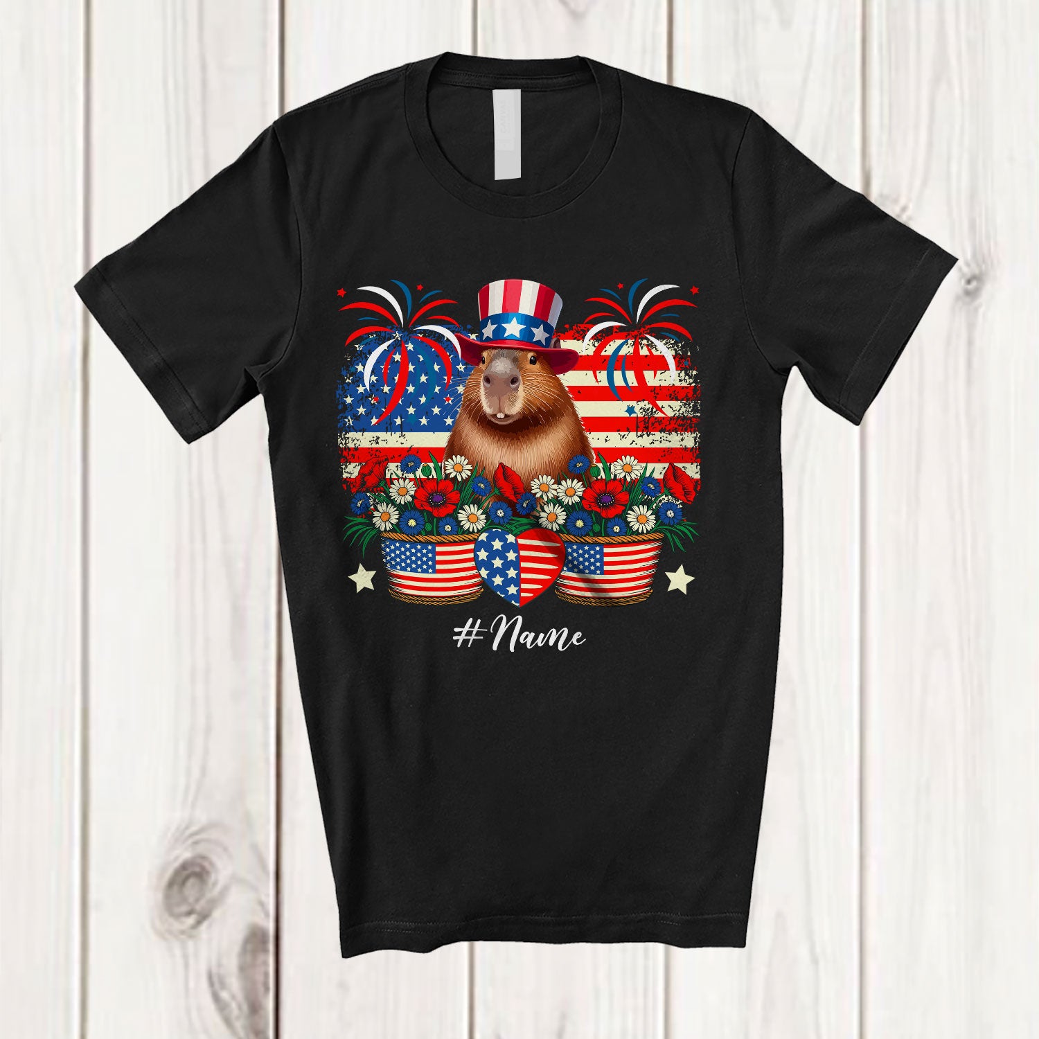 Personalized Capybara Flowers Wearing American Flag Hat; Lovely 4th Of July Custom Name Patriotic T-Shirt. This cotton t-shirt is a durable staple product with a classic fit. One of the most popular items, it has a relaxed style made for everyday and casual wear.