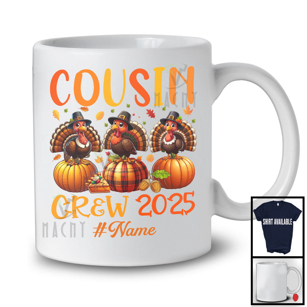 Personalized Cousin Crew 2025, Lovely Thanksgiving Custom Name Family, Three Turkeys Pumpkins T-Shirt