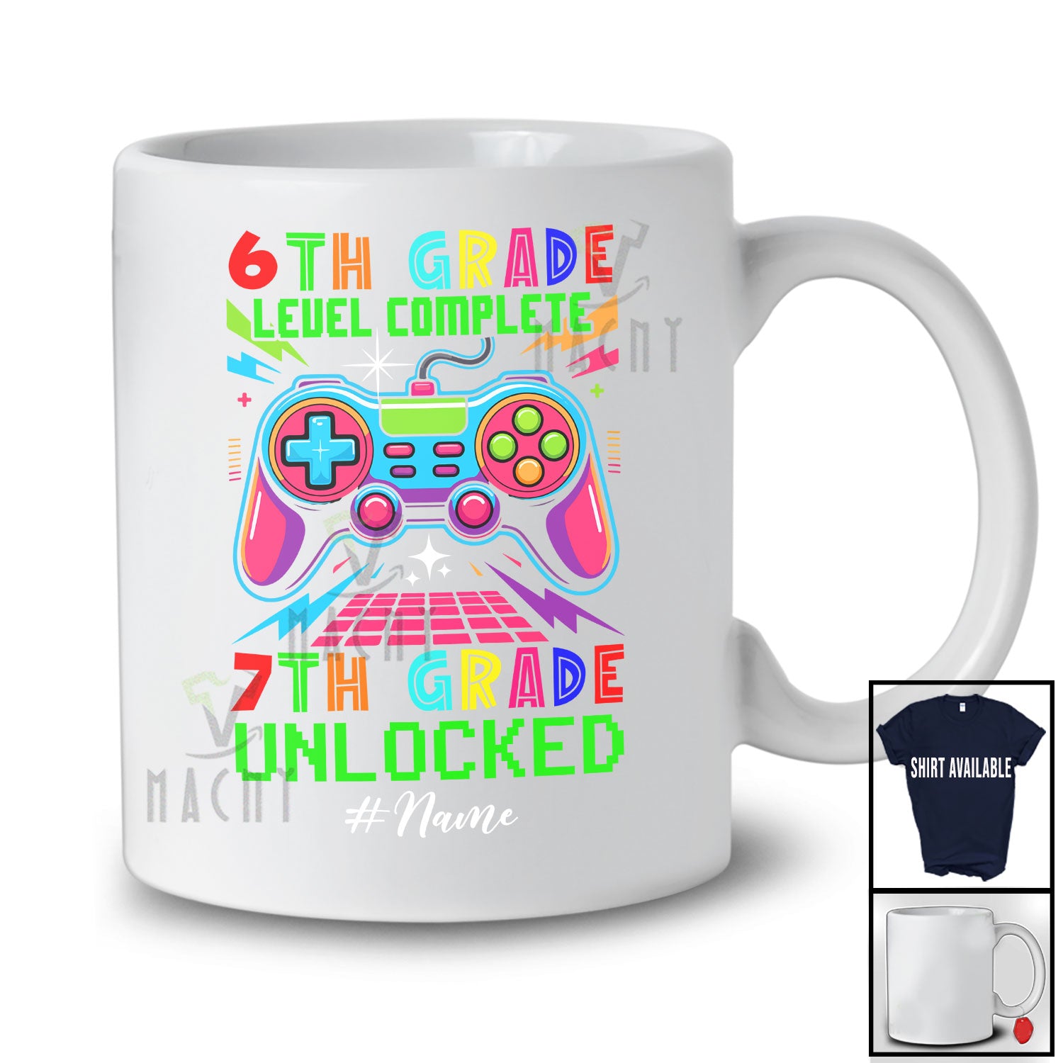 Personalized Custom Name 6th Grade Complete 7th Grade Unlocked; Joyful Back To School Gamer T-Shirt. This cotton t-shirt is a durable staple product with a classic fit. One of the most popular items, it has a relaxed style made for everyday and casual wear.
