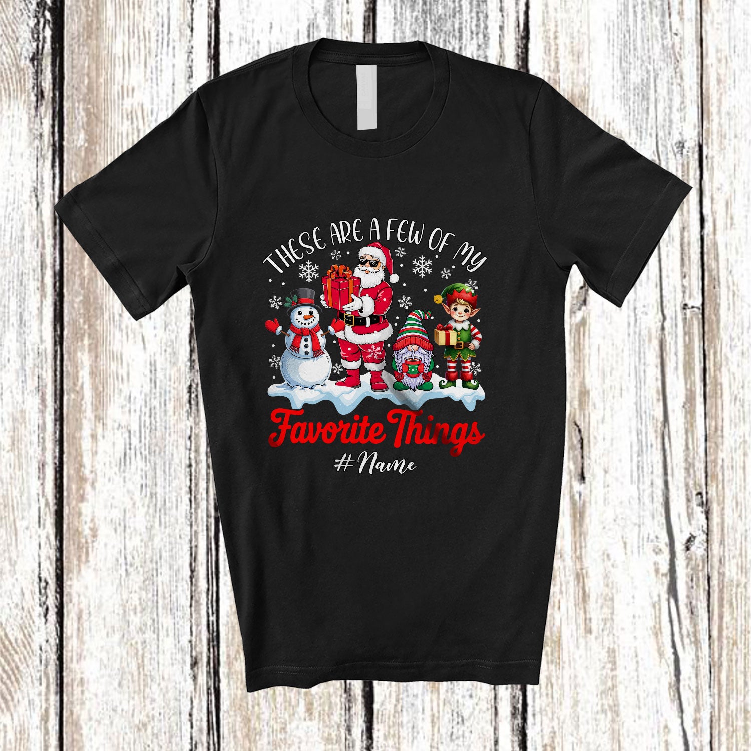 • Personalized Custom Name A Few Of My Favorite Things; Joyful Christmas Santa Elf Snowman Gnome T-Shirt. This cotton t-shirt is a durable staple product with a classic fit. One of the most popular items, it has a relaxed style made for everyday and casual wear.