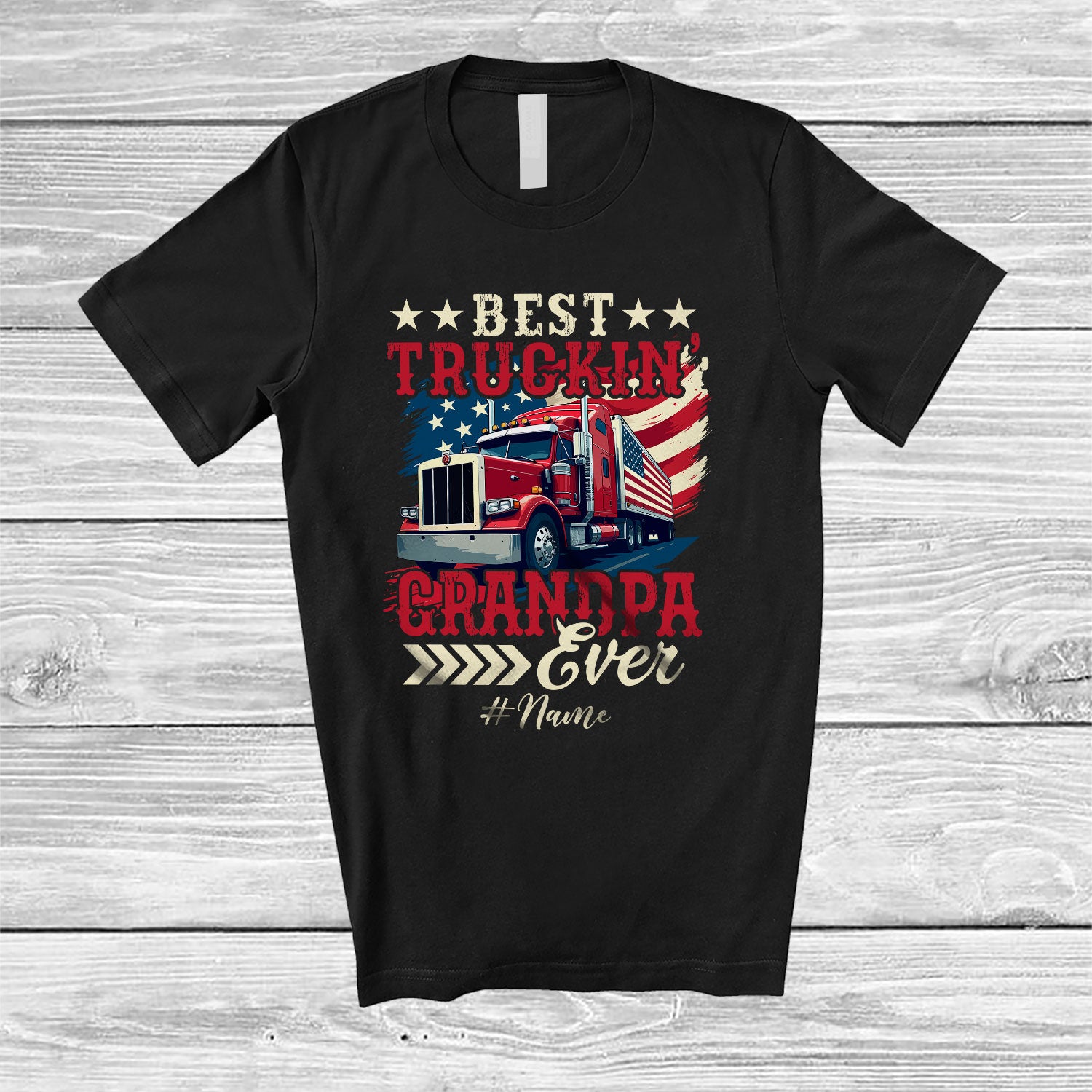 Personalized Custom Name Best Truckin' Grandpa Ever; Proud Father's Day US Flag Trucker Family T-Shirt