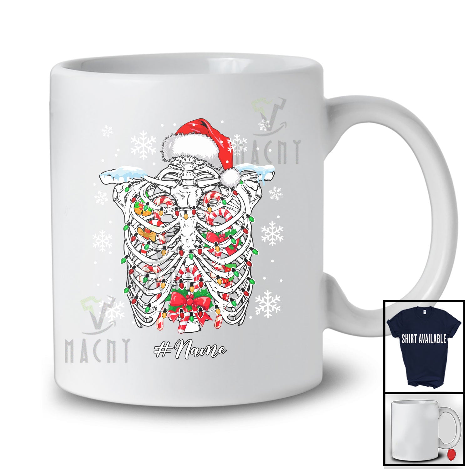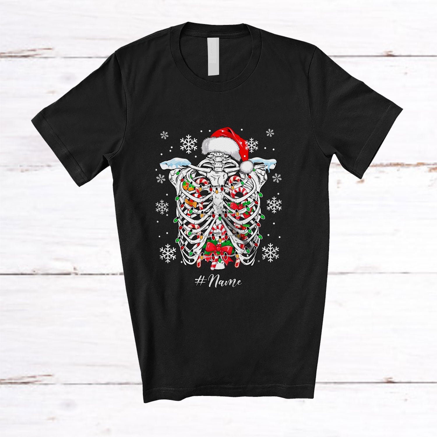 Personalized Custom Name Candy Cane Rib Cage; Humorous Christmas Lights Santa Skeleton X-Ray T-Shirt