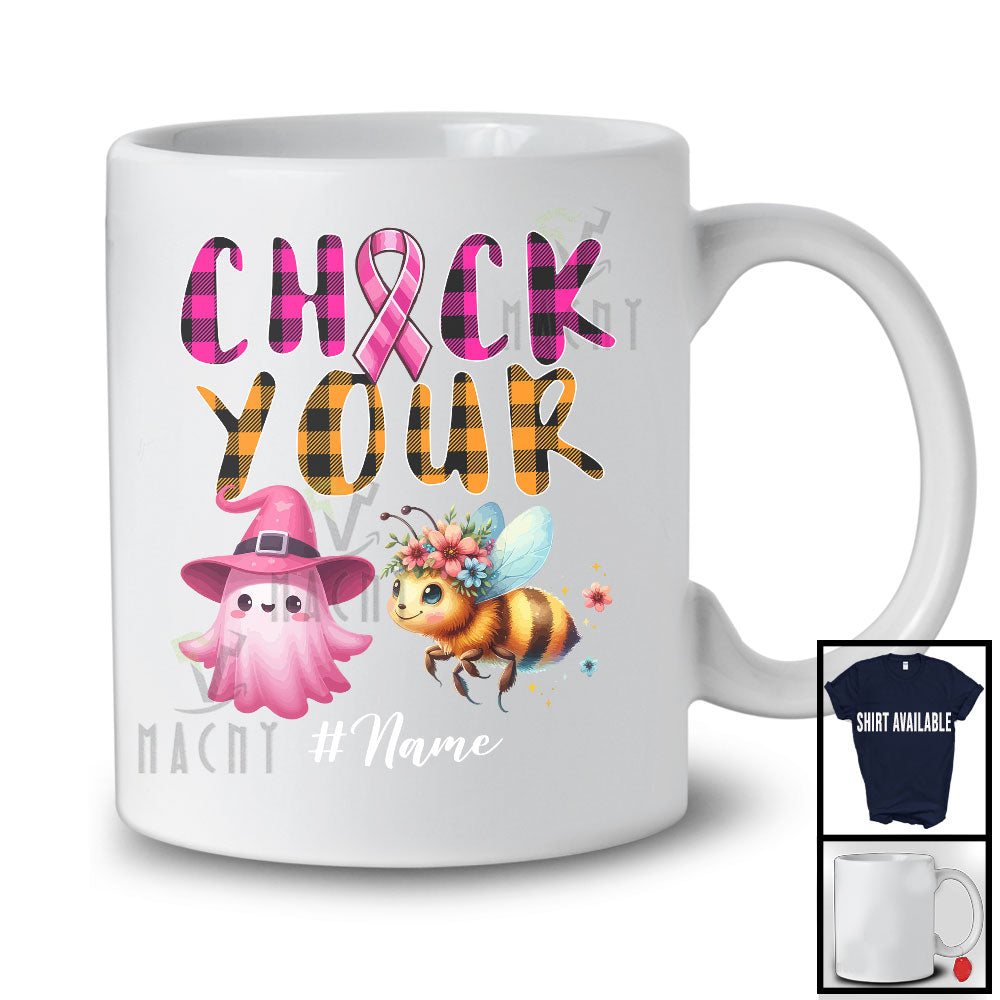 Personalized Custom Name Check Your Boo Bees; Happy Halloween Breast Cancer Pink Plaid Ghost T-Shirt