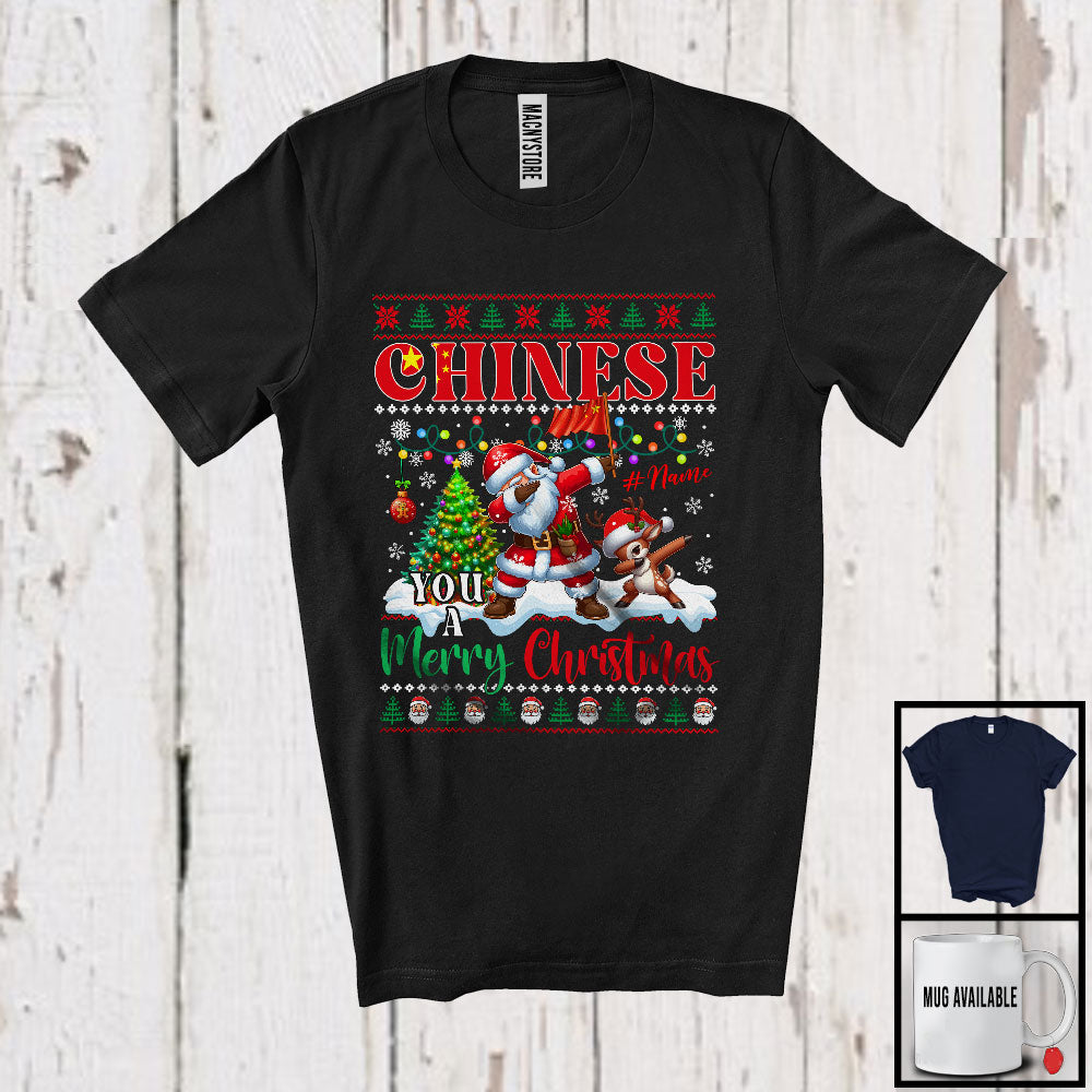 Personalized Custom Name Chinese You A Merry Christmas; Joyful Sweater Dabbing Santa; Family T-Shirt. This cotton t-shirt is a durable staple product with a classic fit. One of the most popular items, it has a relaxed style made for everyday and casual wear.