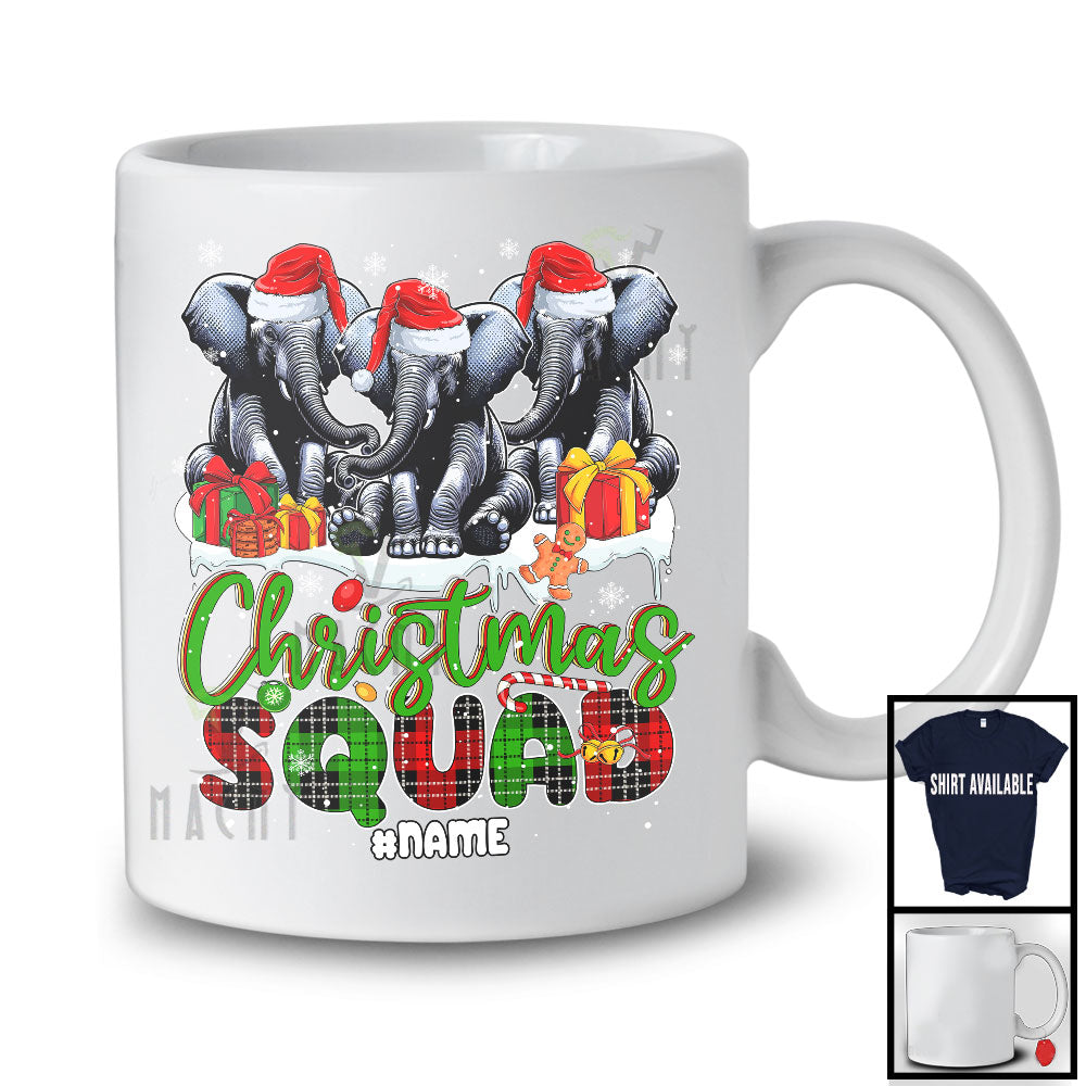 • Personalized Custom Name Christmas Squad; Lovely Plaid Three Santa Elephants; Animal Lover T-Shirt. This cotton t-shirt is a durable staple product with a classic fit. One of the most popular items, it has a relaxed style made for everyday and casual wear.