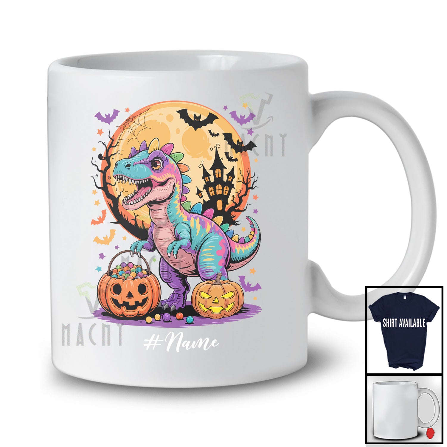 new MacnyStore - Personalized Custom Name Colorful T-Rex Holding Carved Pumpkin; Lovely Halloween Moon Dinosaur T-Shirt – Macnystore