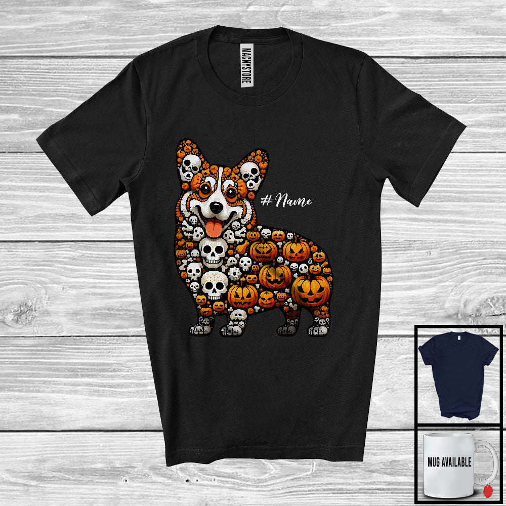 Personalized Custom Name Corgi Skull Pumpkin Shape; Creepy Halloween Animal Lover T-Shirt