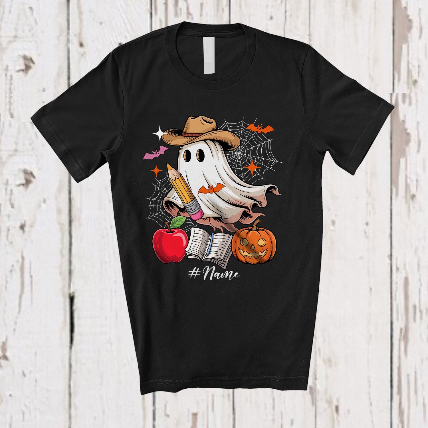 Personalized Custom Name Cowboy Teacher Boo Ghost; Lovely Halloween Western Pumpkin T-Shirt. This cotton t-shirt is a durable staple product with a classic fit. One of the most popular items, it has a relaxed style made for everyday and casual wear.