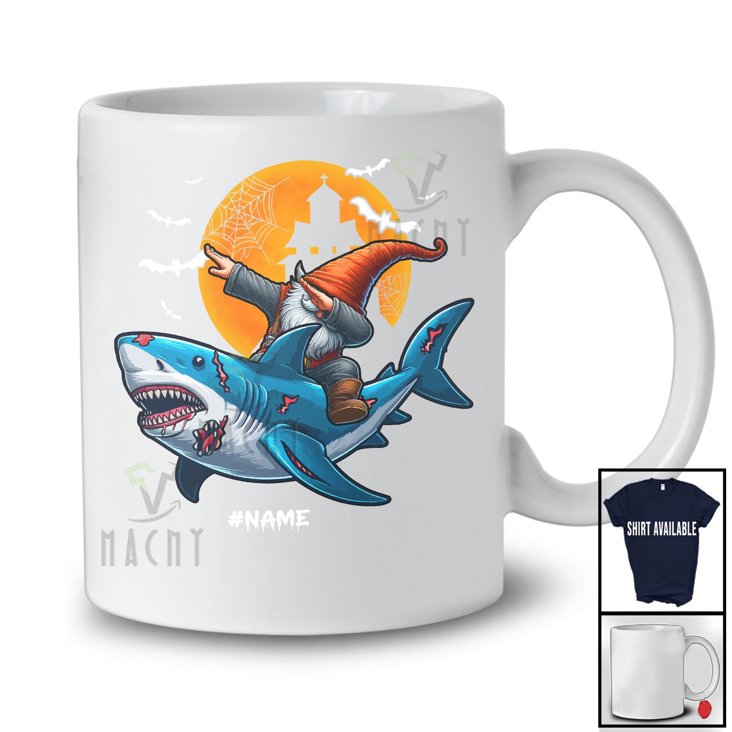 • Personalized Custom Name Dabbing Gnome Riding Shark; Creepy Halloween Gnome Family Group T-Shirt. This cotton t-shirt is a durable staple product with a classic fit. One of the most popular items, it has a relaxed style made for everyday and casual wear.