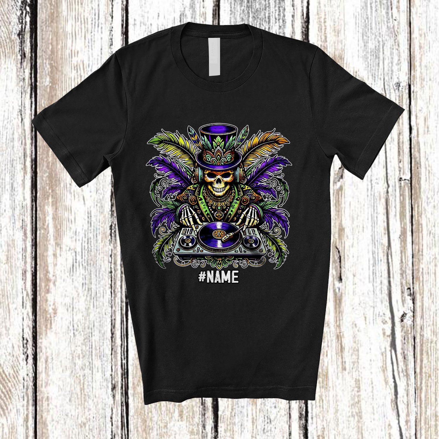Personalized Custom Name DJ Mardi Gras Skeleton; Joyful Mardi Gras Skeleton Music; Parades T-Shirt. This cotton t-shirt is a durable staple product with a classic fit. One of the most popular items, it has a relaxed style made for everyday and casual wear.