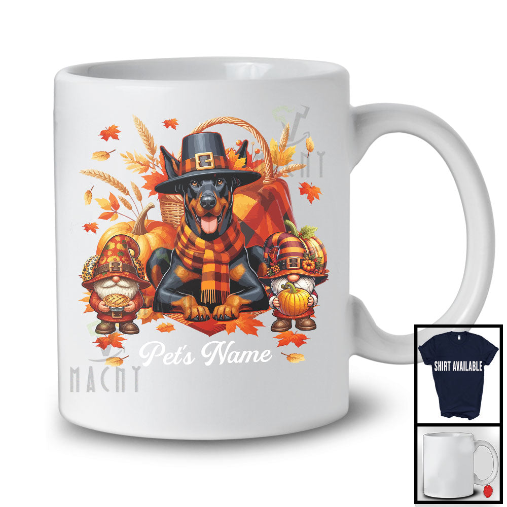 Personalized Custom Name Dobermann Gnomes, Lovely Thanksgiving Fall Leaves, Pumpkins T-Shirt. This cotton t-shirt is a durable staple product with a classic fit. One of the most popular items, it has a relaxed style made for everyday and casual wear.