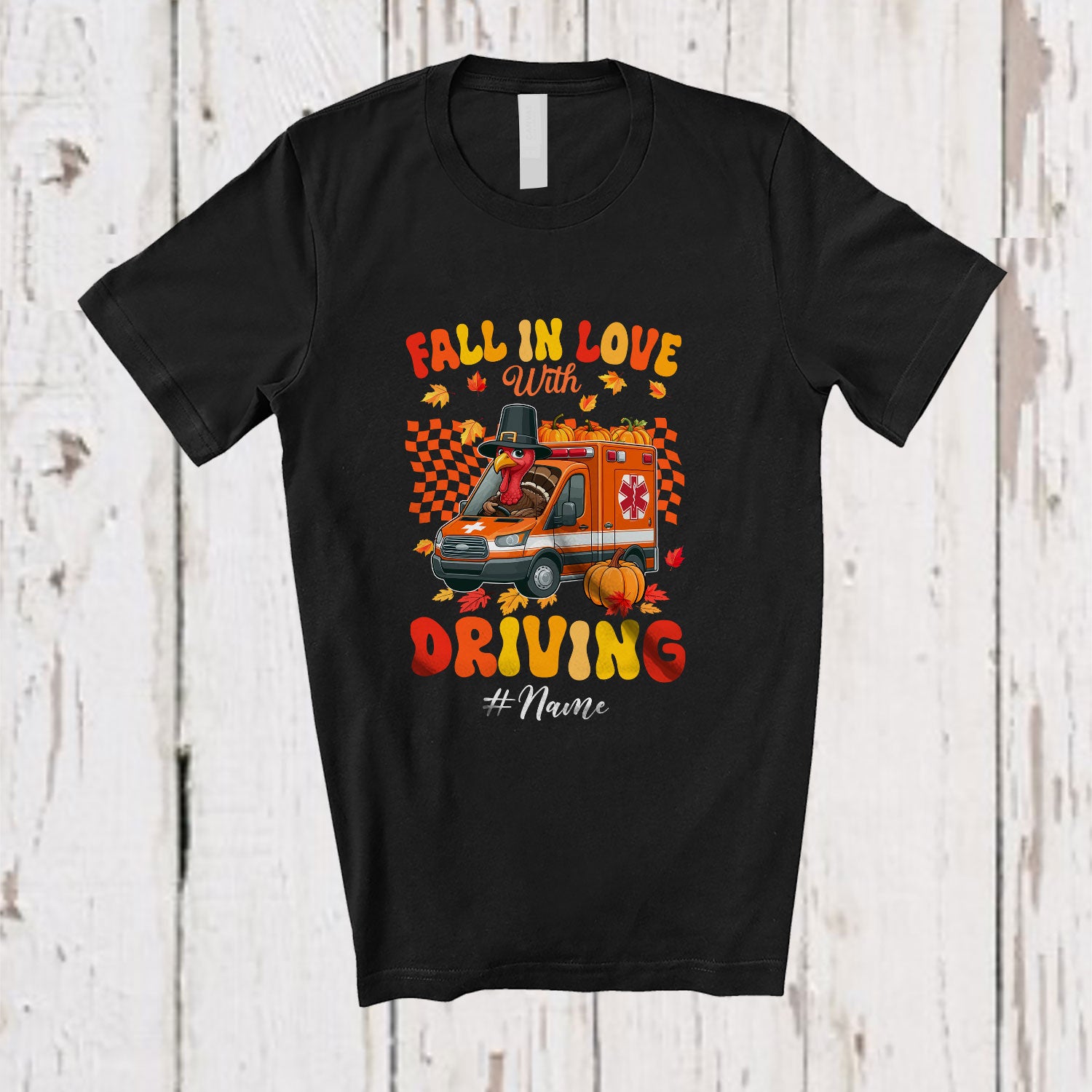 • Personalized Custom Name Fall In Love With Driving; Amazing Thanksgiving Pumpkin Ambulance T-Shirt. This cotton t-shirt is a durable staple product with a classic fit. One of the most popular items, it has a relaxed style made for everyday and casual wear.