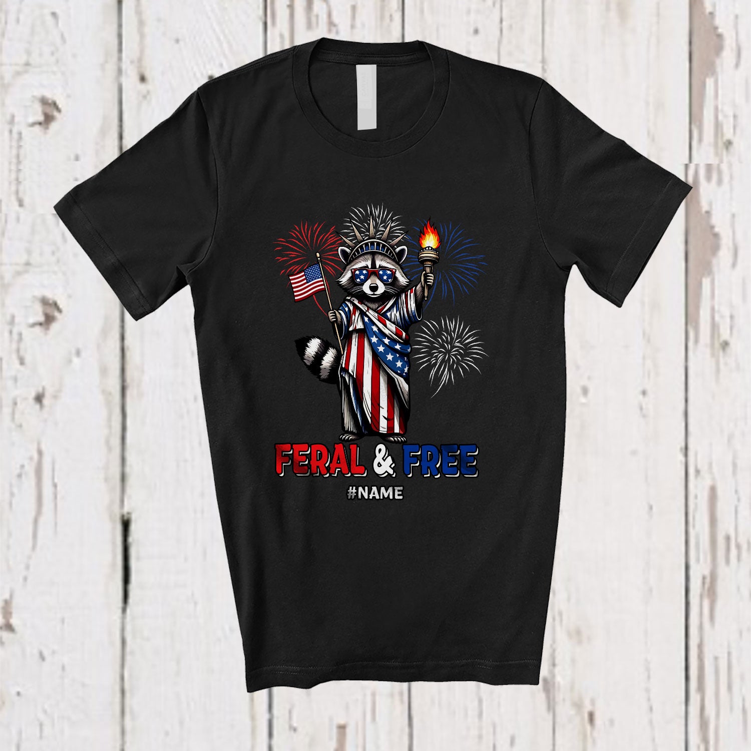 Personalized Custom Name Feral and Free; Proud 4th of July Raccoon Liberty; American Patriotic T-Shirt. This cotton t-shirt is a durable staple product with a classic fit. One of the most popular items, it has a relaxed style made for everyday and casual wear.
