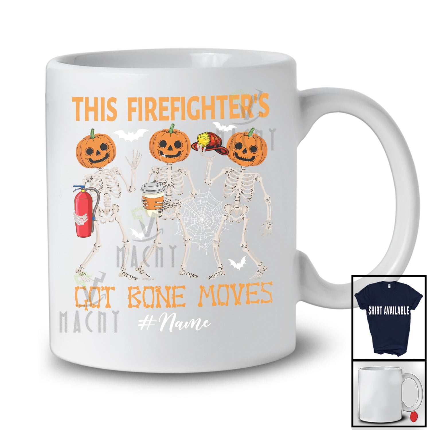 • Personalized Custom Name Firefighter's Got Bone Moves; Joyful Halloween Pumpkin Skeletons T-Shirt. This cotton t-shirt is a durable staple product with a classic fit. One of the most popular items, it has a relaxed style made for everyday and casual wear.