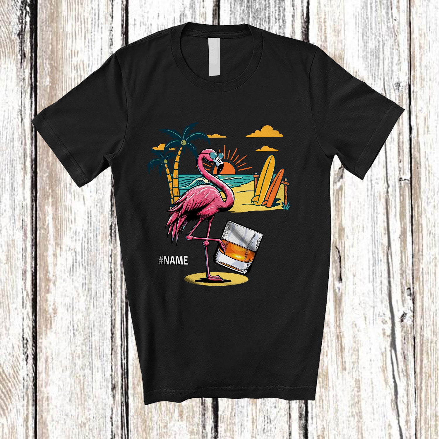 • Personalized Custom Name Flamingo Drinking Rum; Cheerful Summer Vacation Alcohol Drunker T-Shirt. This cotton t-shirt is a durable staple product with a classic fit. One of the most popular items, it has a relaxed style made for everyday and casual wear.