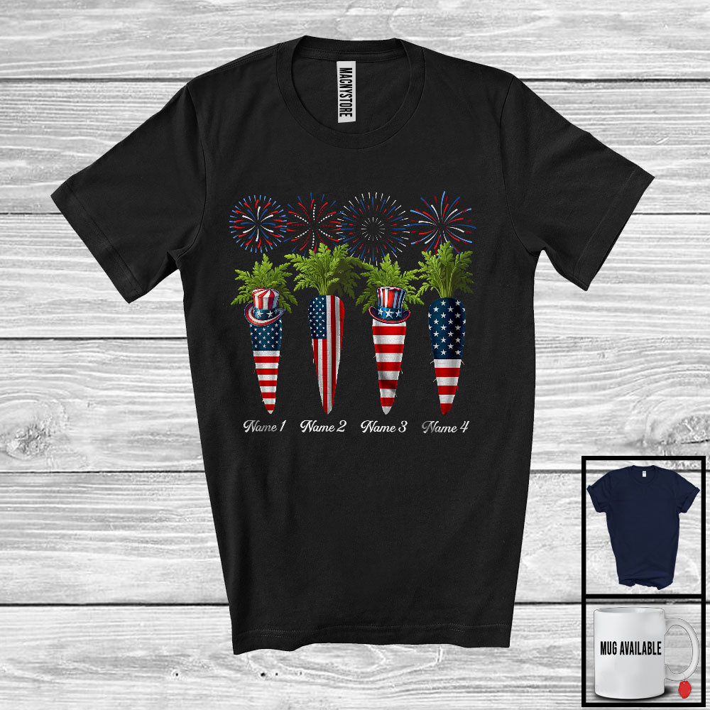 • Personalized Custom Name Four Carrot, Lovely 4th Of July Fireworks, Vegan Patriotic Group T-Shirt. This cotton t-shirt is a durable staple product with a classic fit. One of the most popular items, it has a relaxed style made for everyday and casual wear.