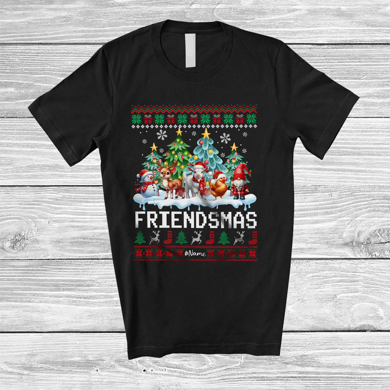 Personalized Custom Name Friendsmas; Amusing Christmas Sweater Goat Chicken Reindeer Santa Elf Squad T-Shirt. This cotton t-shirt is a durable staple product with a classic fit. One of the most popular items, it has a relaxed style made for everyday and casual wear.