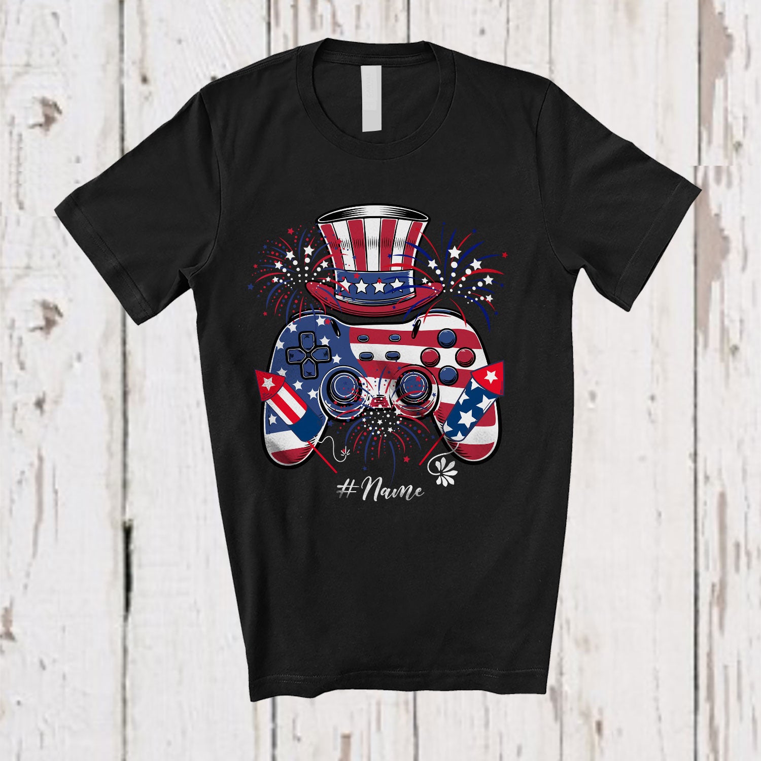 • Personalized Custom Name Game Controller; Amazing 4th of July US Flag Gamer Patriotic T-Shirt. This cotton t-shirt is a durable staple product with a classic fit. One of the most popular items, it has a relaxed style made for everyday and casual wear.