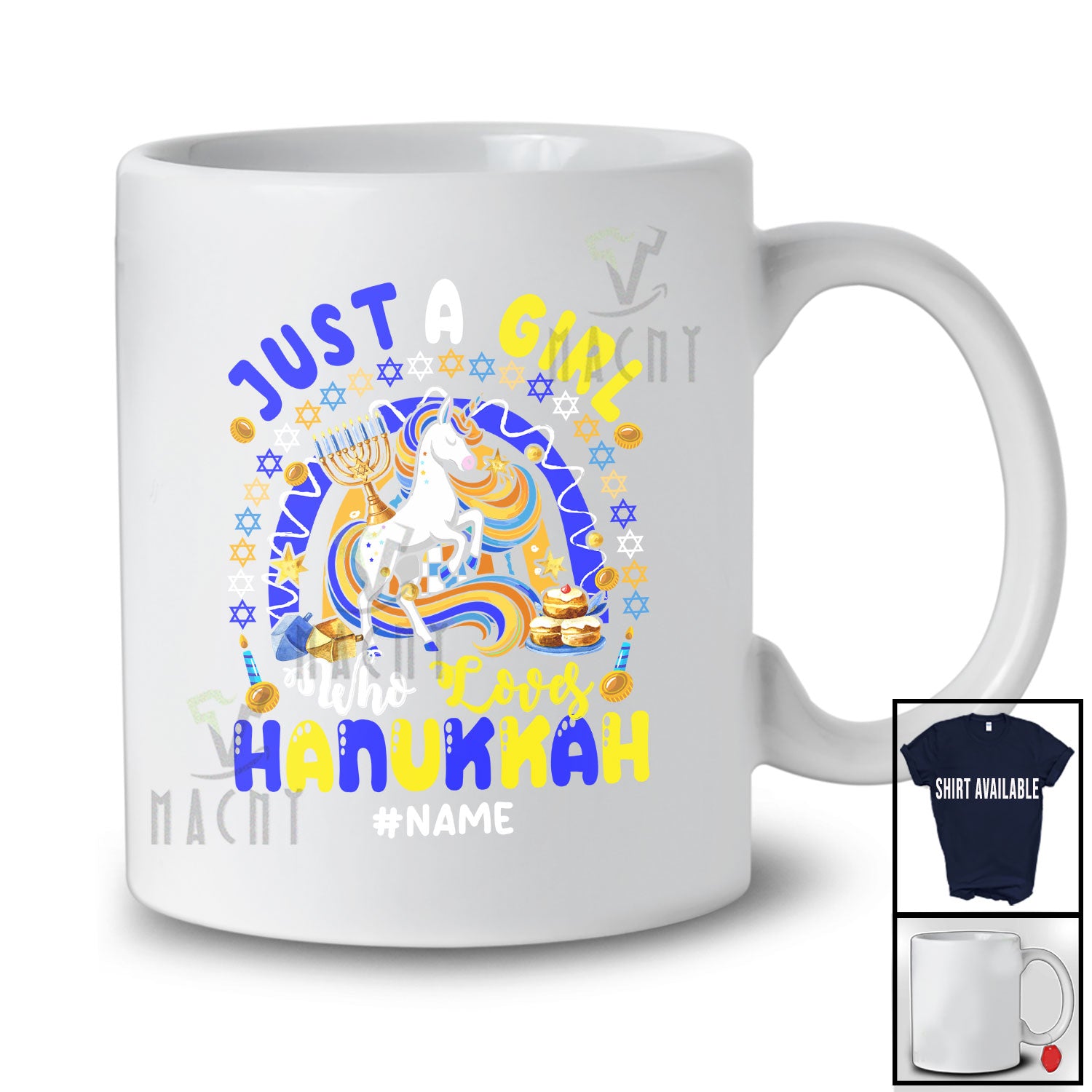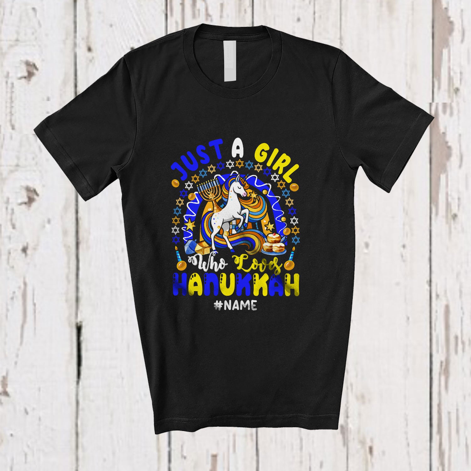 Personalized Custom Name Girl Who Loves Hanukkah; Lovely Lights Unicorn; Leopard Rainbow T-Shirt. This cotton t-shirt is a durable staple product with a classic fit. One of the most popular items, it has a relaxed style made for everyday and casual wear.