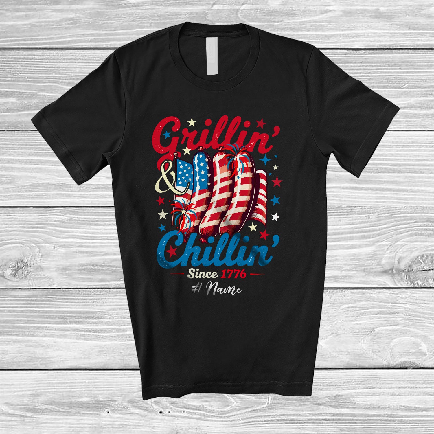 Personalized Custom Name Grillin' and Chillin' 1776; Humorous 4th of July Sausage Food; Patriotic T-Shirt