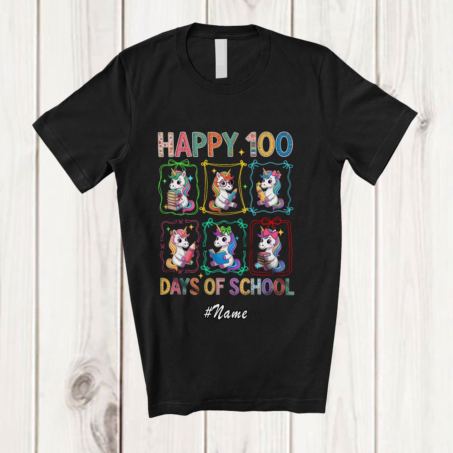 • Personalized Custom Name Happy 100 Days Of School; Lovely Unicorn Reading Books Studying T-Shirt. This cotton t-shirt is a durable staple product with a classic fit. One of the most popular items, it has a relaxed style made for everyday and casual wear.
