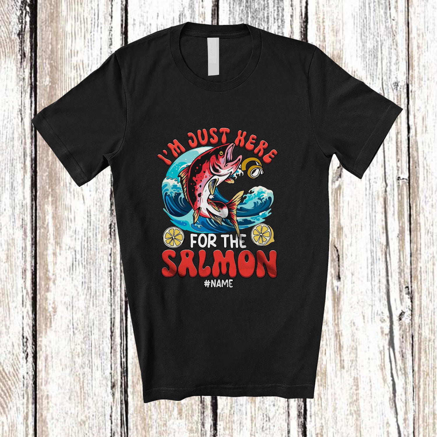 Personalized Custom Name Here For The Salmon; Humorous Seafood Boil Party Fishing Food T-Shirt. This cotton t-shirt is a durable staple product with a classic fit. One of the most popular items, it has a relaxed style made for everyday and casual wear.