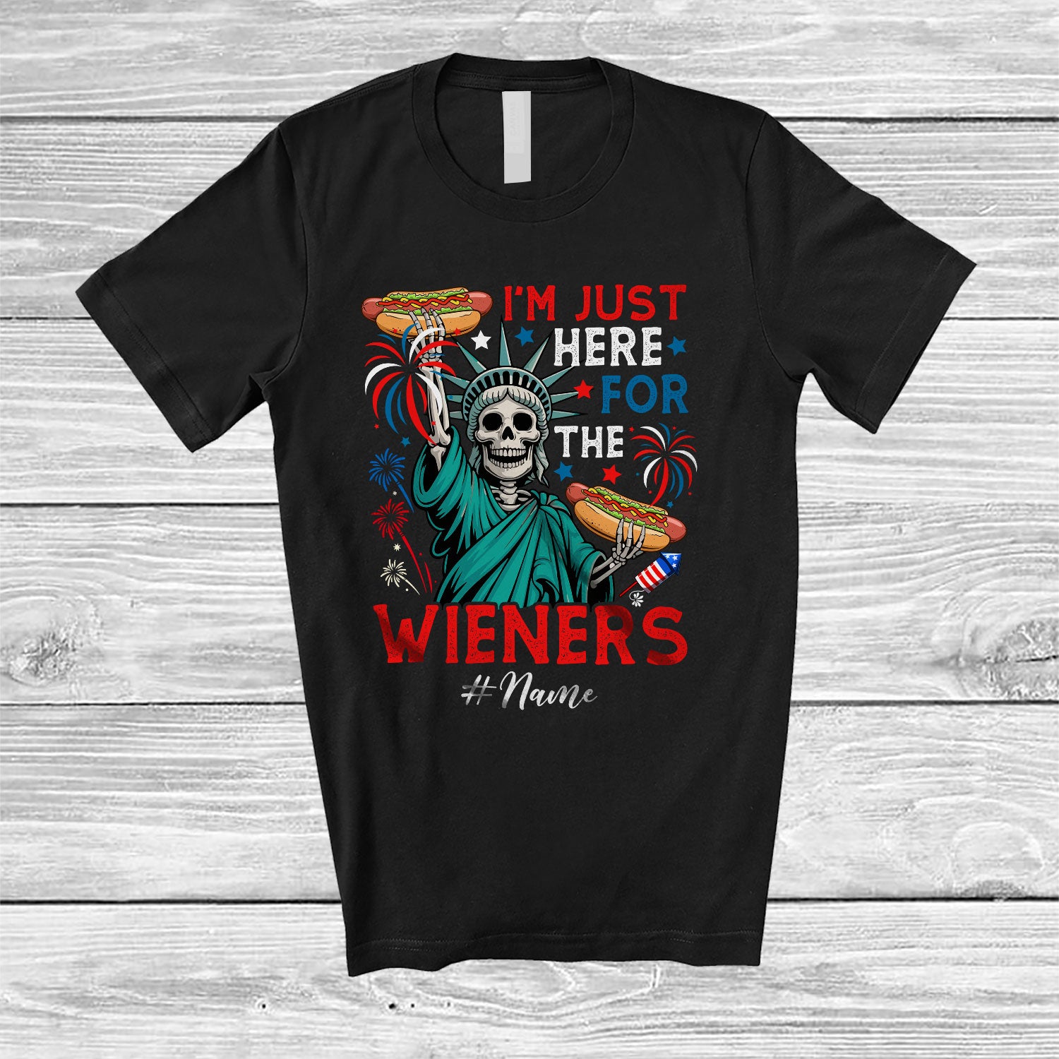 Personalized Custom Name Here For The Wieners; Amazing 4th Of July Skeleton Liberty Hot Dog T-Shirt