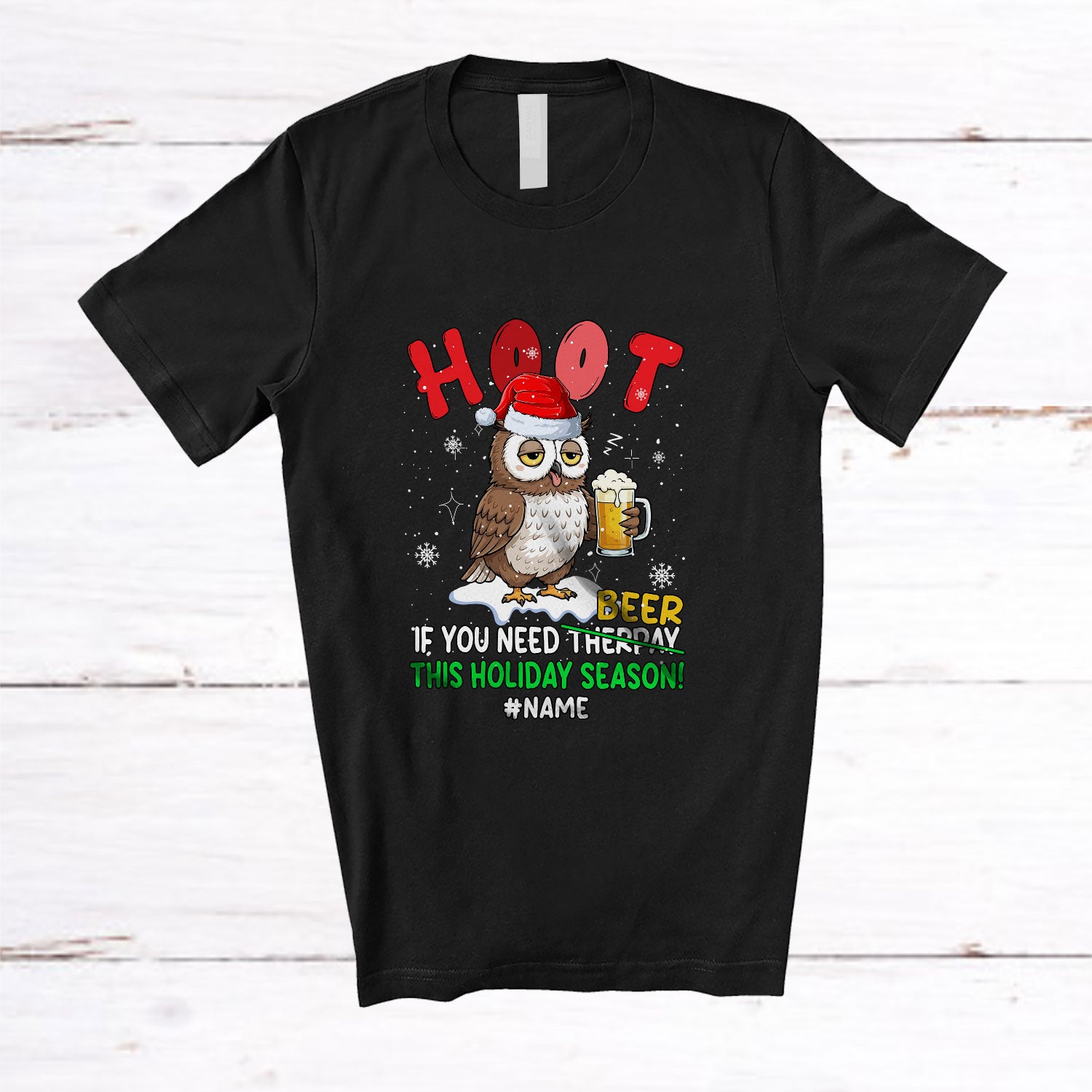Personalized Custom Name Hoot If You Need Beer; Humorous Christmas Santa Owl Drinking Beer T-Shirt