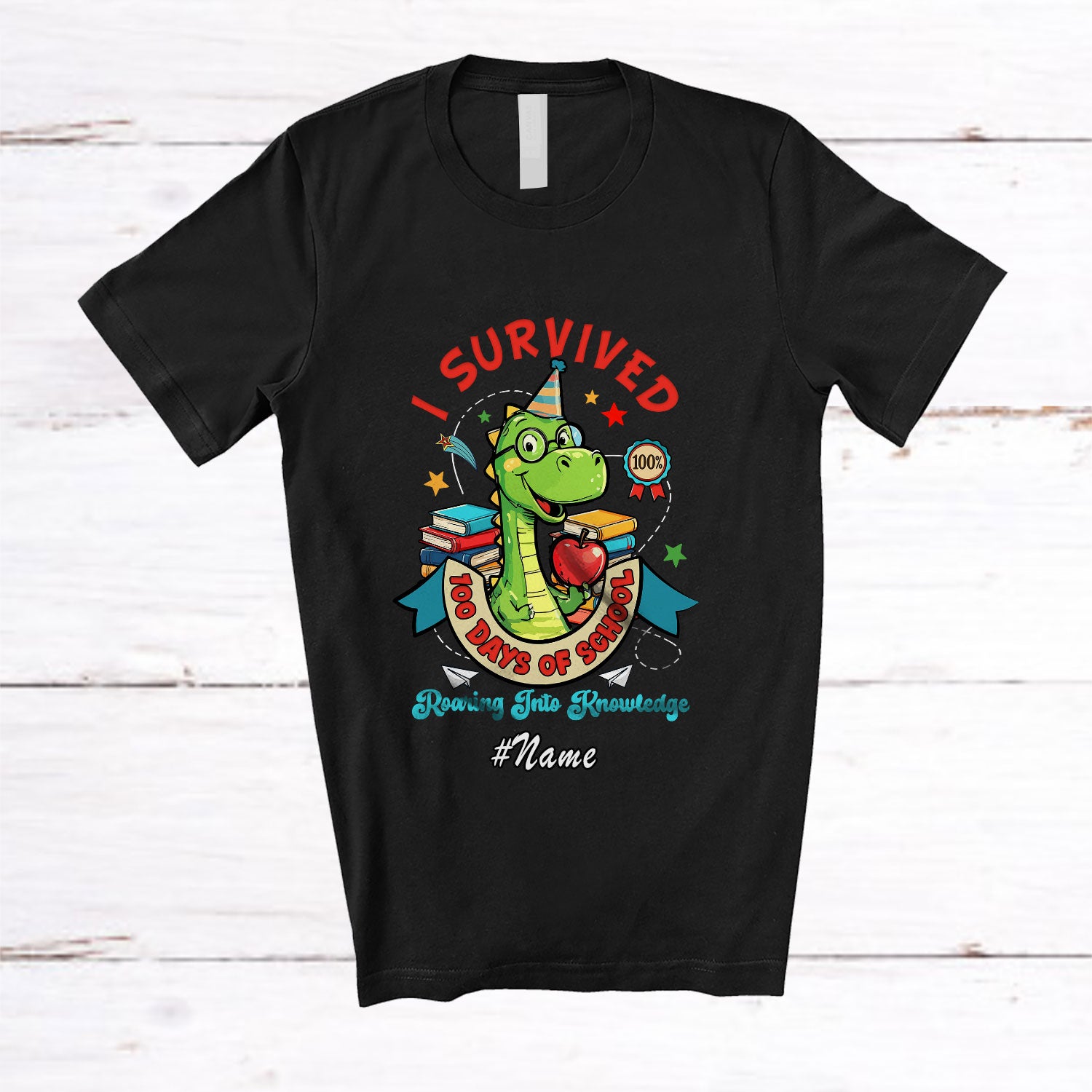• Personalized Custom Name I Survived 100 Days Of School; Lovely Dinosaur T-Rex Student Teacher T-Shirt. This cotton t-shirt is a durable staple product with a classic fit. One of the most popular items, it has a relaxed style made for everyday and casual wear.