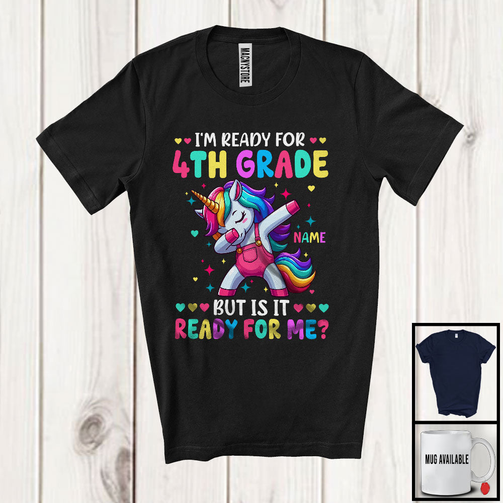 • Personalized Custom Name I'm Ready For 4th Grade; Joyful Back To School Dabbing Unicorn T-Shirt. This cotton t-shirt is a durable staple product with a classic fit. One of the most popular items, it has a relaxed style made for everyday and casual wear.