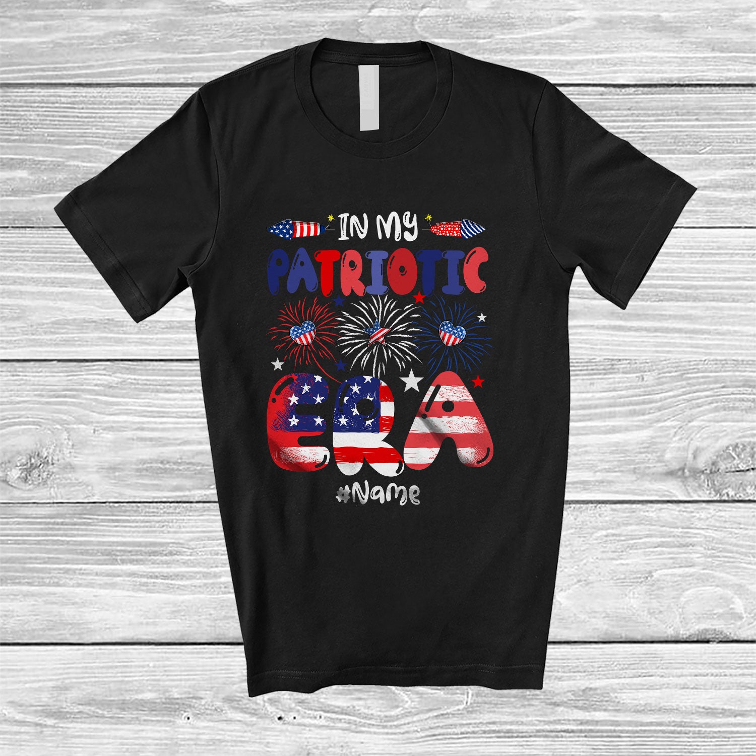 Personalized Custom Name In My Patriotic Era; Amazing 4th of July US Flag Fireworks; Family T-Shirt. This cotton t-shirt is a durable staple product with a classic fit. One of the most popular items, it has a relaxed style made for everyday and casual wear.