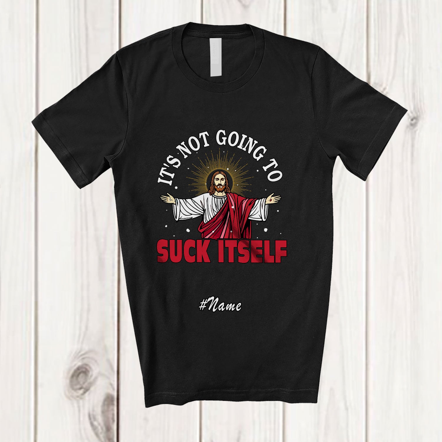 Personalized Custom Name It's Not Going To Suck Itself; Humorous Christmas Jesus Family T-Shirt. This cotton t-shirt is a durable staple product with a classic fit. One of the most popular items, it has a relaxed style made for everyday and casual wear.