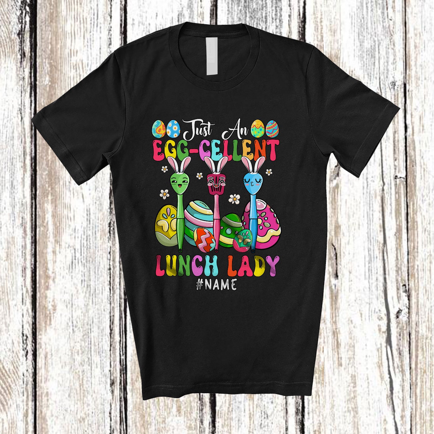 • Personalized Custom Name Just An Egg-cellent Lunch Lady; Joyful Easter Excellent 3 Bunnies Eggs T-Shirt. This cotton t-shirt is a durable staple product with a classic fit. One of the most popular items, it has a relaxed style made for everyday and casual wear.