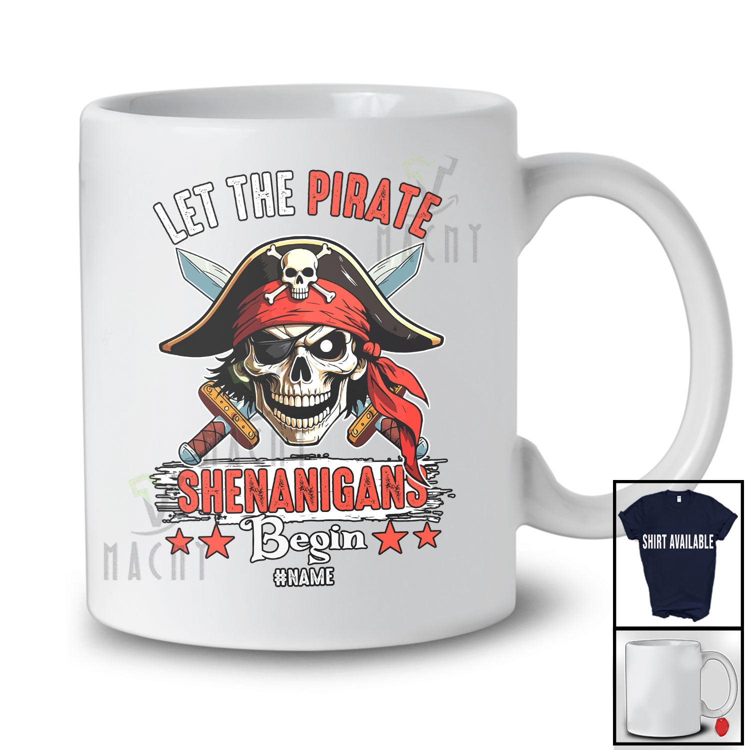 • Personalized Custom Name Let The Pirate Shenanigans Begin; Creepy Halloween Pirate Skull T-Shirt. This cotton t-shirt is a durable staple product with a classic fit. One of the most popular items, it has a relaxed style made for everyday and casual wear.