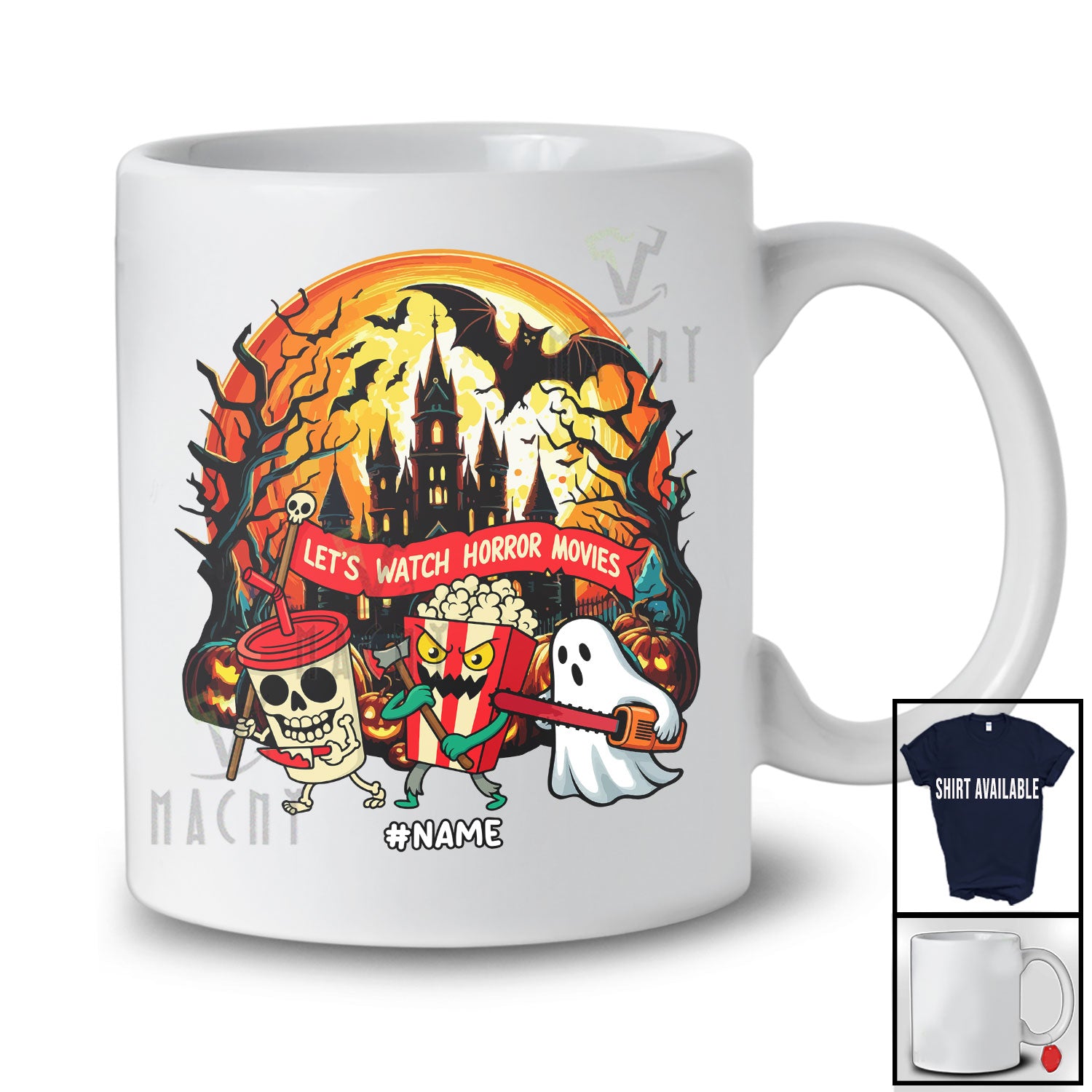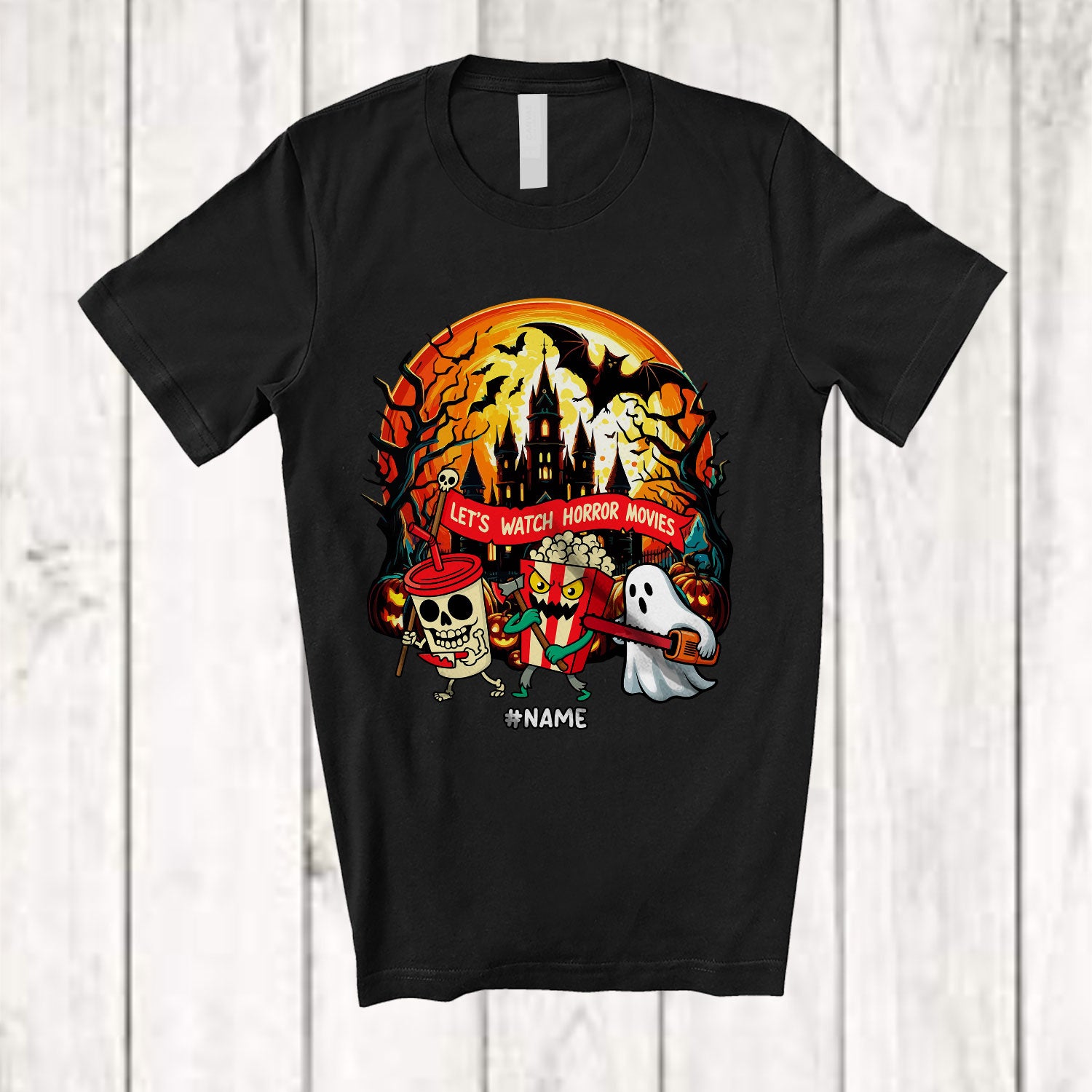 Personalized Custom Name Let's Watch Horror Movies; Scary Halloween Moon Skeleton Boo Ghost T-Shirt. This cotton t-shirt is a durable staple product with a classic fit. One of the most popular items, it has a relaxed style made for everyday and casual wear.