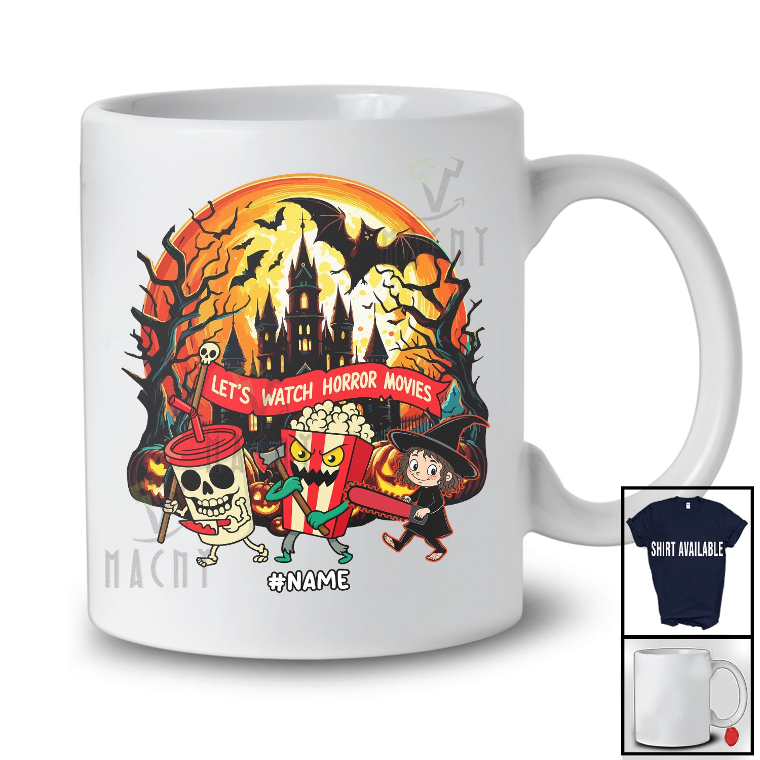 • Personalized Custom Name Let's Watch Horror Movies; Scary Halloween Moon Skeleton Witch T-Shirt. This cotton t-shirt is a durable staple product with a classic fit. One of the most popular items, it has a relaxed style made for everyday and casual wear.