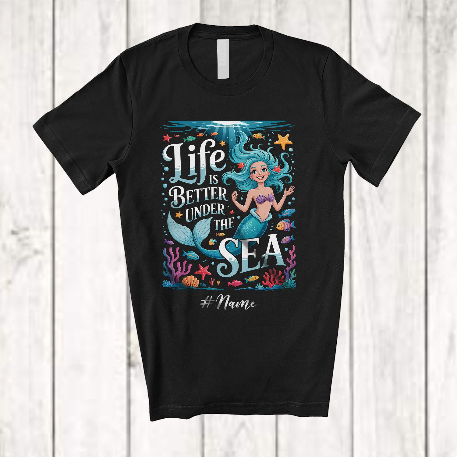The Personalized Custom Name Life Is Better Under The Sea; Lovely Summer Mermaid; Girls Family T-Shirt destined to impress, and priced at only $12.95, for a limited time.