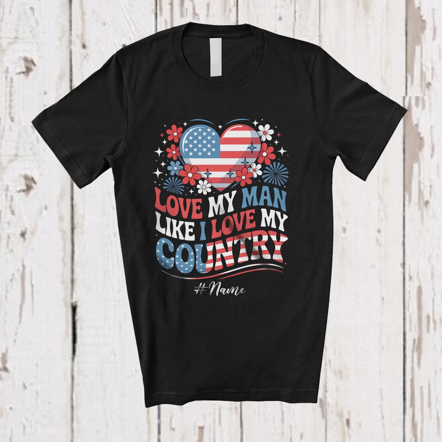 • Personalized Custom Name Love My Man Like My Country; Amazing 4th Of July Heart Couple T-Shirt. This cotton t-shirt is a durable staple product with a classic fit. One of the most popular items, it has a relaxed style made for everyday and casual wear.