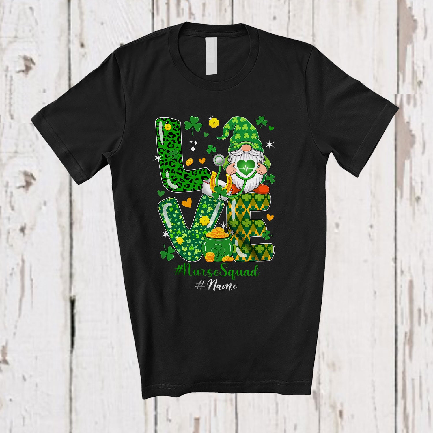 • Personalized Custom Name Love Nurse Squad; Lovely St. Patrick's Day Gnome Leopard T-Shirt. This cotton t-shirt is a durable staple product with a classic fit. One of the most popular items, it has a relaxed style made for everyday and casual wear.
