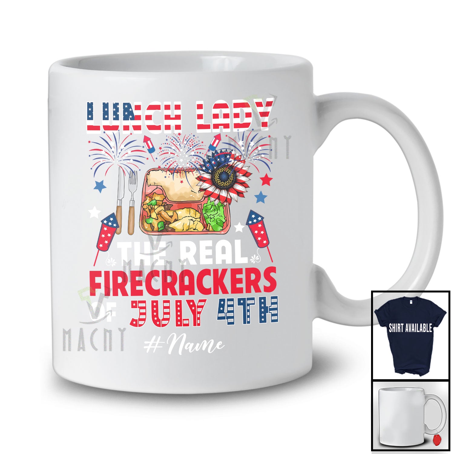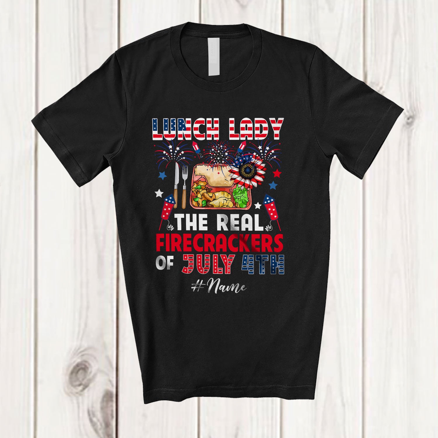 Personalized Custom Name Lunch Lady Real Firecrackers; Joyful 4th Of July Fireworks; Patriotic T-Shirt. This cotton t-shirt is a durable staple product with a classic fit. One of the most popular items, it has a relaxed style made for everyday and casual wear.