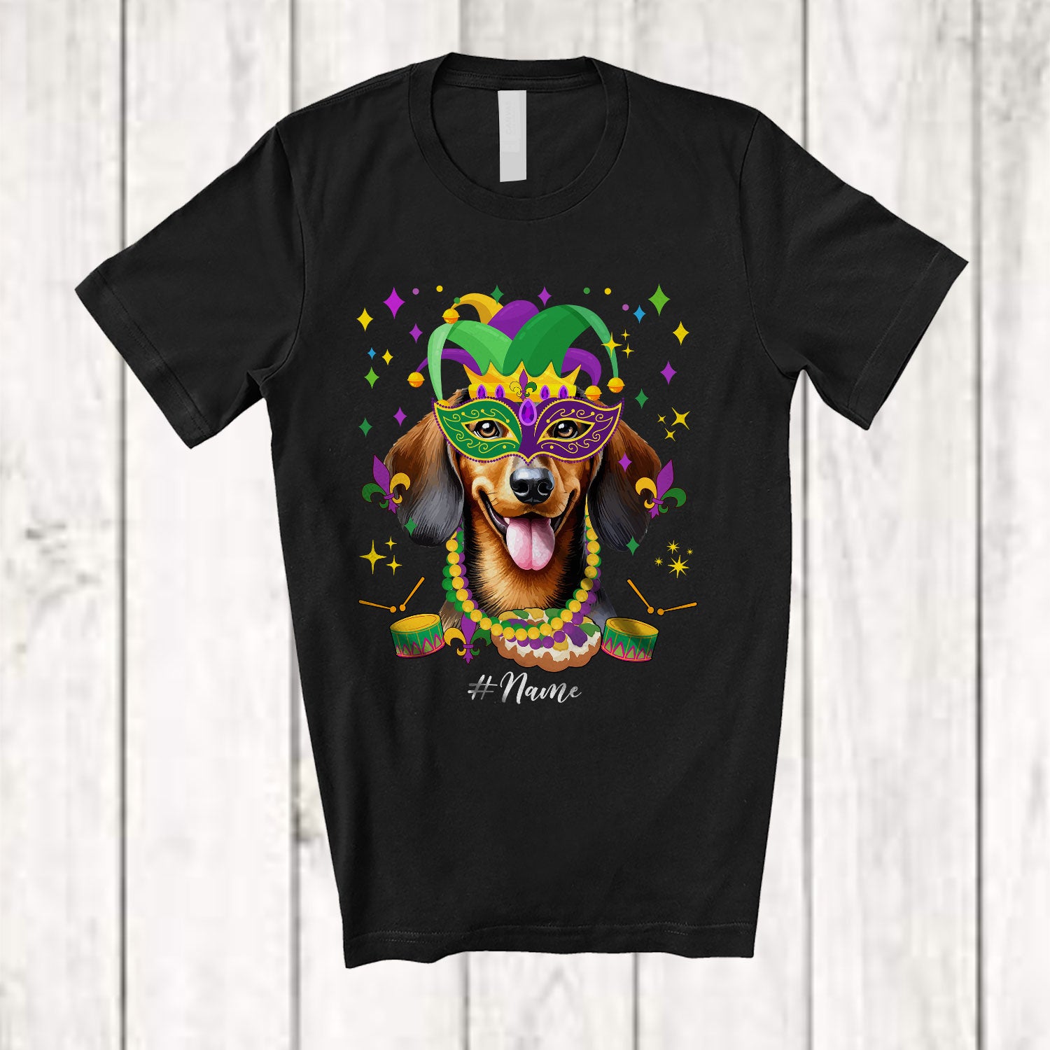Personalized Custom Name Mardi Gras Mask Dachshund Face; Joyful Parades Jester Hat Beads T-Shirt. This cotton t-shirt is a durable staple product with a classic fit. One of the most popular items, it has a relaxed style made for everyday and casual wear.