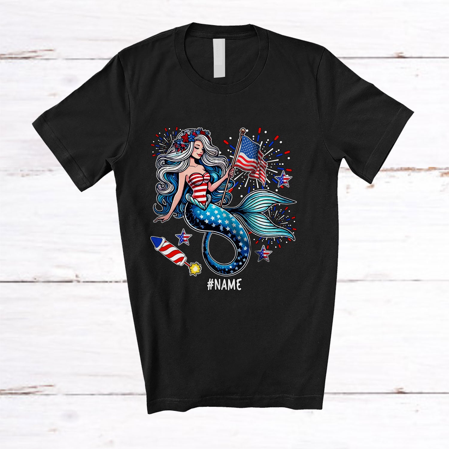 • Personalized Custom Name Mermaid 4th Of July; Lovely American Flag Mermaid Cosplay; Family T-Shirt. This cotton t-shirt is a durable staple product with a classic fit. One of the most popular items, it has a relaxed style made for everyday and casual wear.