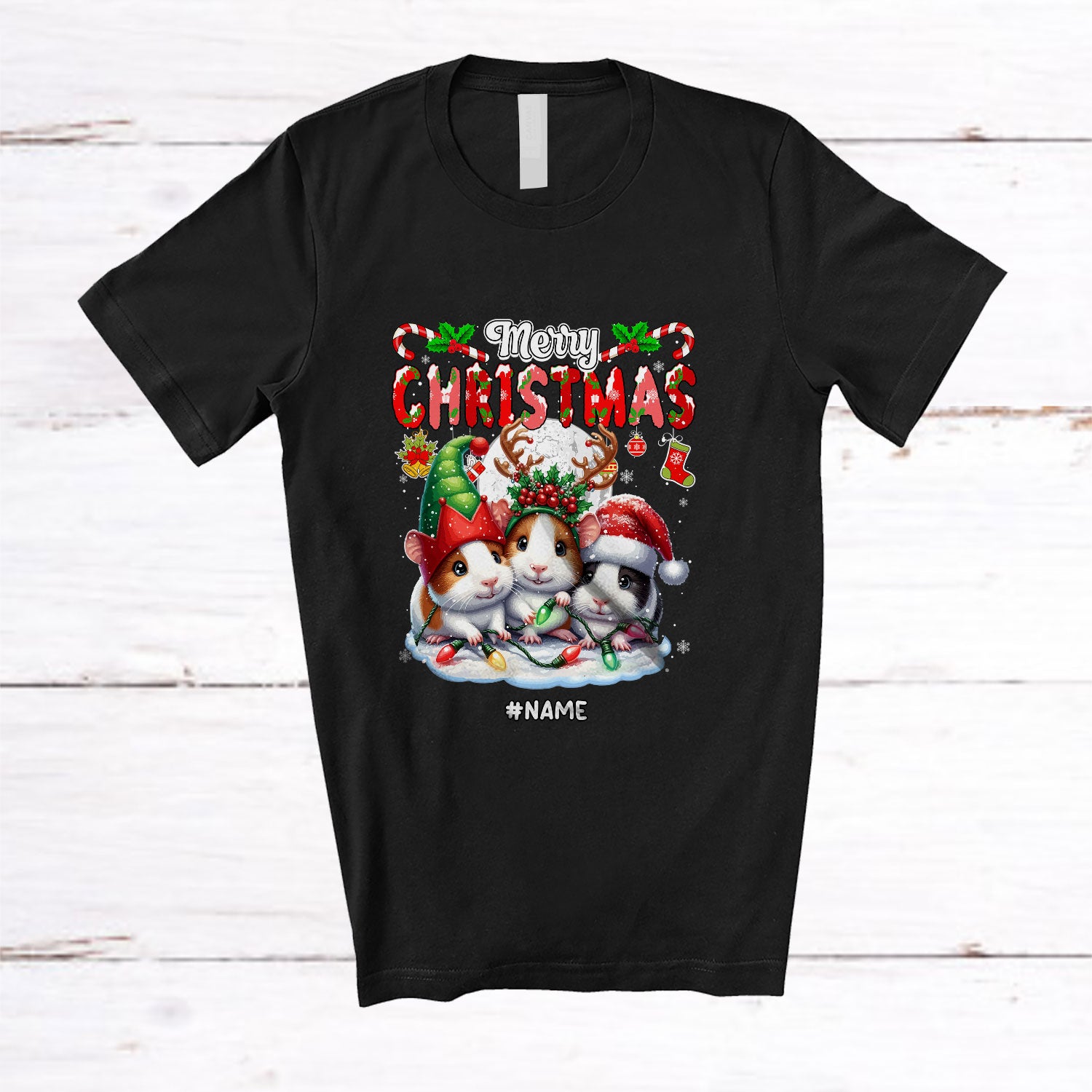 Personalized Custom Name Merry Christmas; Lovely X-mas Lights Three Guinea Pig Animal Lover T-Shirt. This cotton t-shirt is a durable staple product with a classic fit. One of the most popular items, it has a relaxed style made for everyday and casual wear.