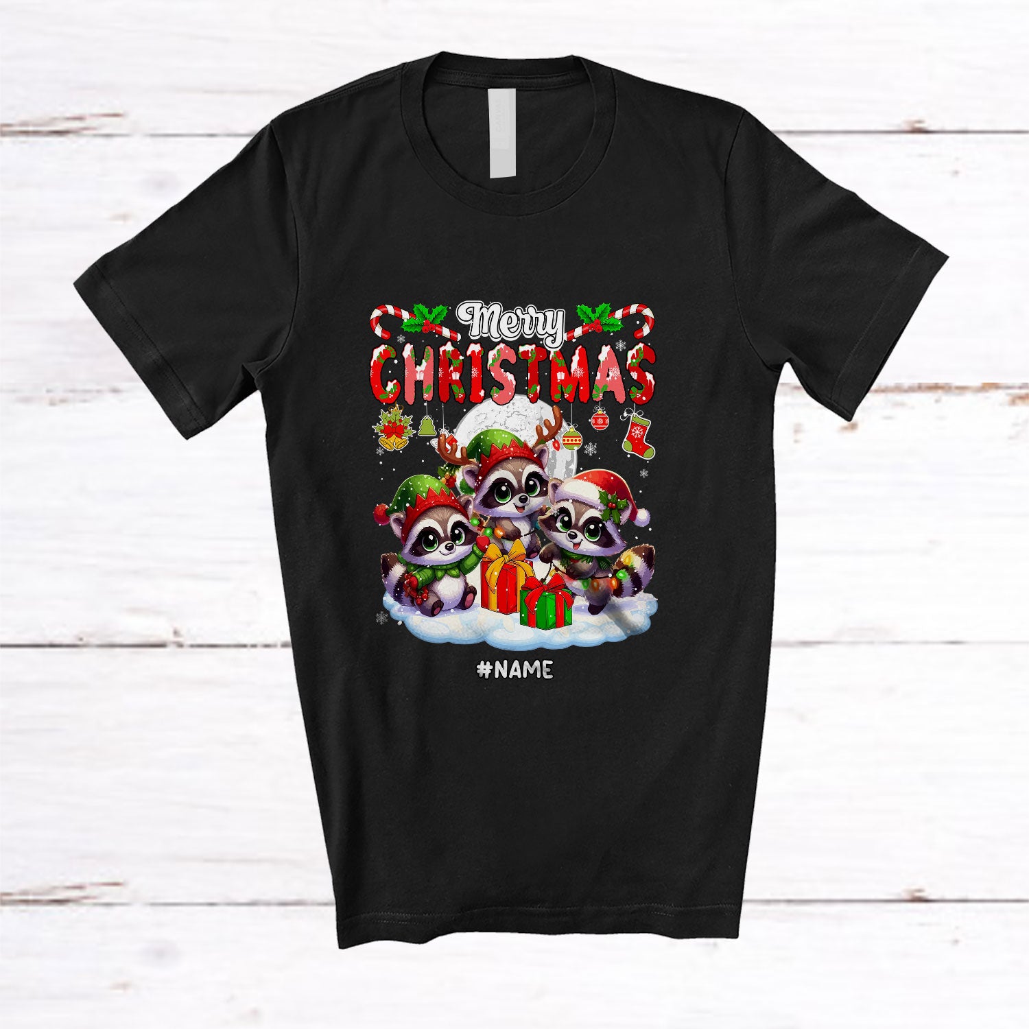 Personalized Custom Name Merry Christmas; Lovely X-mas Lights Three Raccoon Animal Lover T-Shirt
